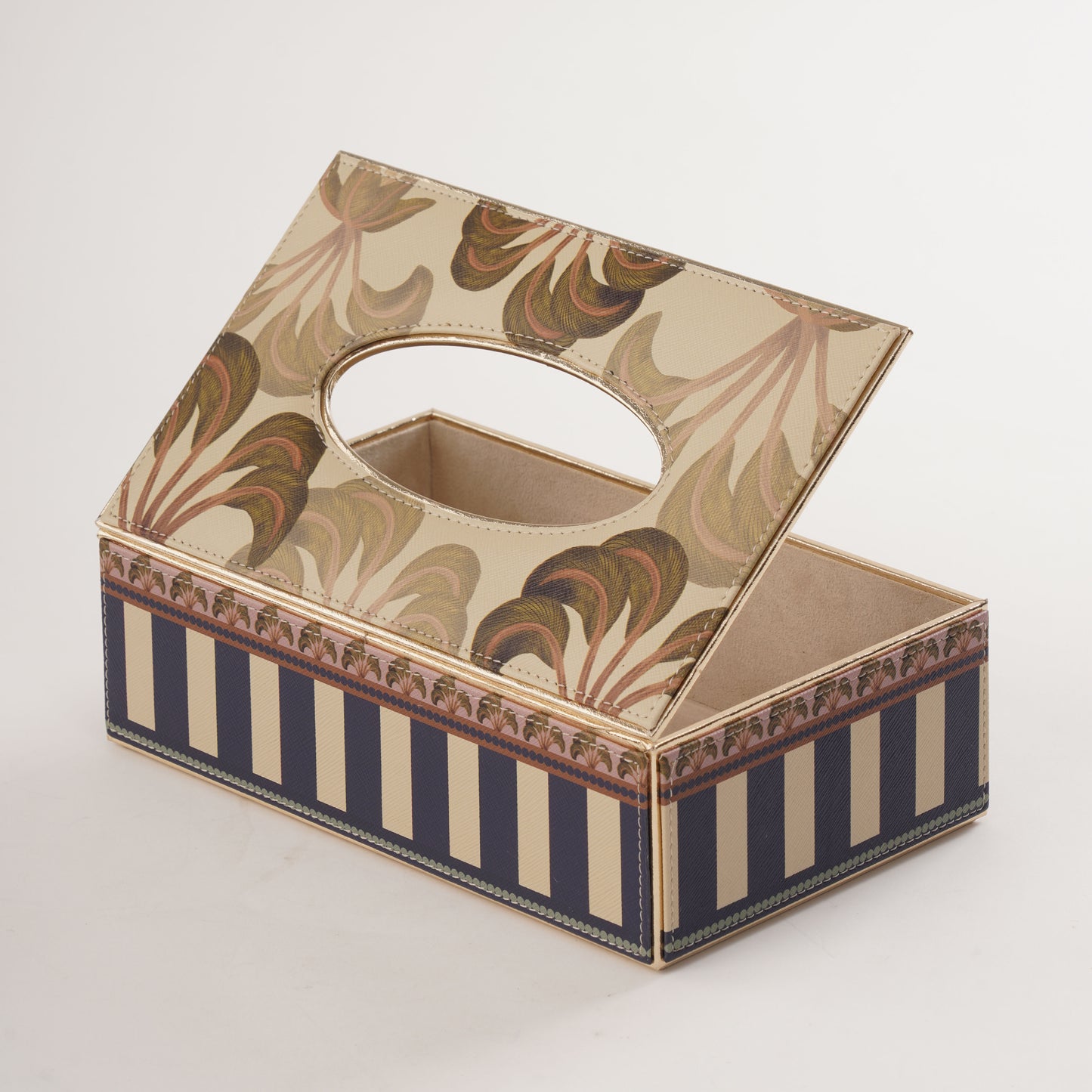 This blue solene tissue box is a refined rectangular holder wrapped featuring intricate tropical leaf motifs on the lid. Its hinged design makes refilling easy, while the elegant detailing brings a touch of luxury to living rooms, bedrooms, or office spaces.
