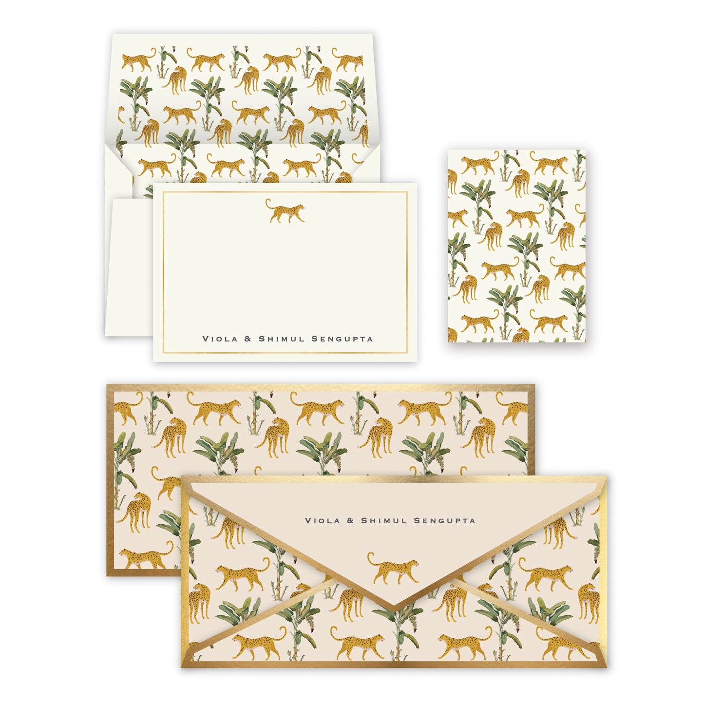 Bold leopard print across a complete personalised stationery set — perfect for those who love stationery with a wild, confident edge. Each piece is customised with your name in your choice of typeface.