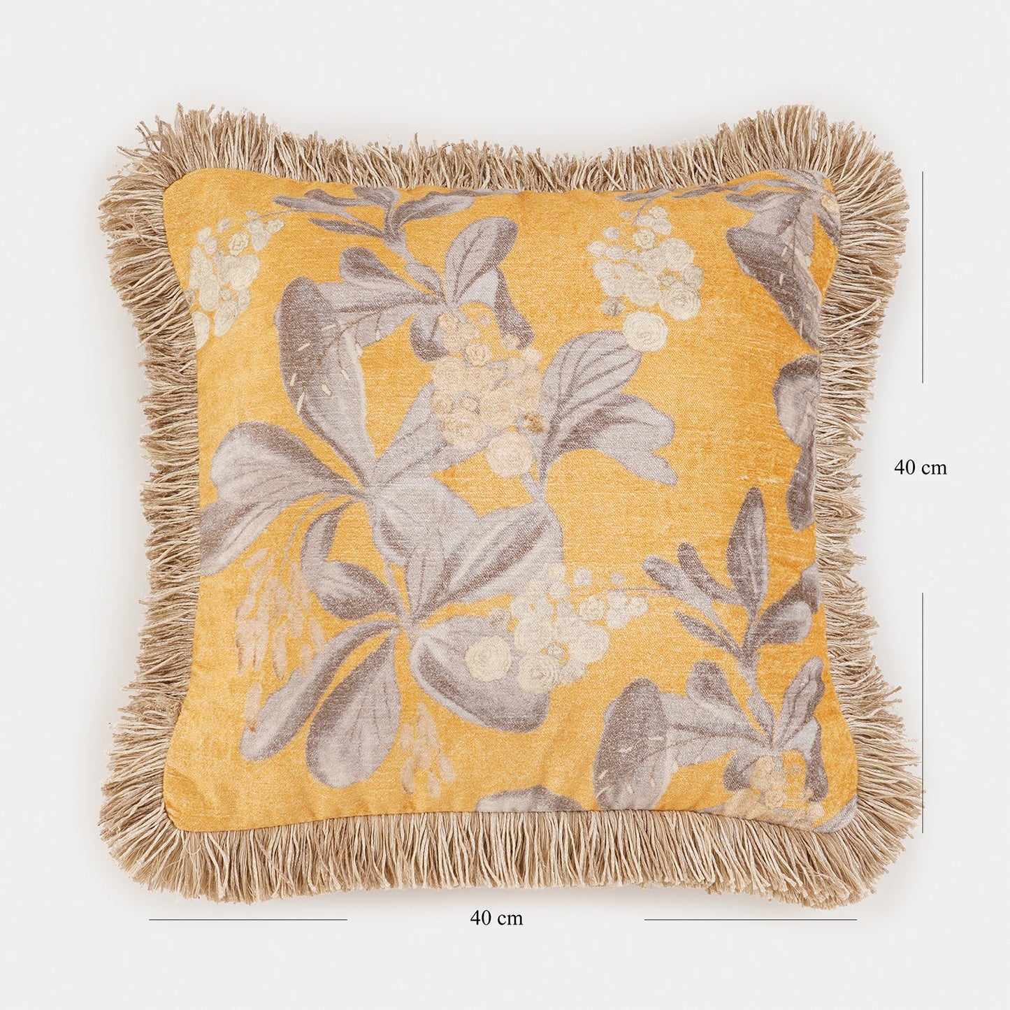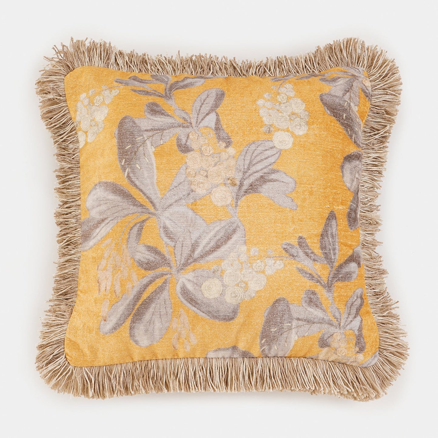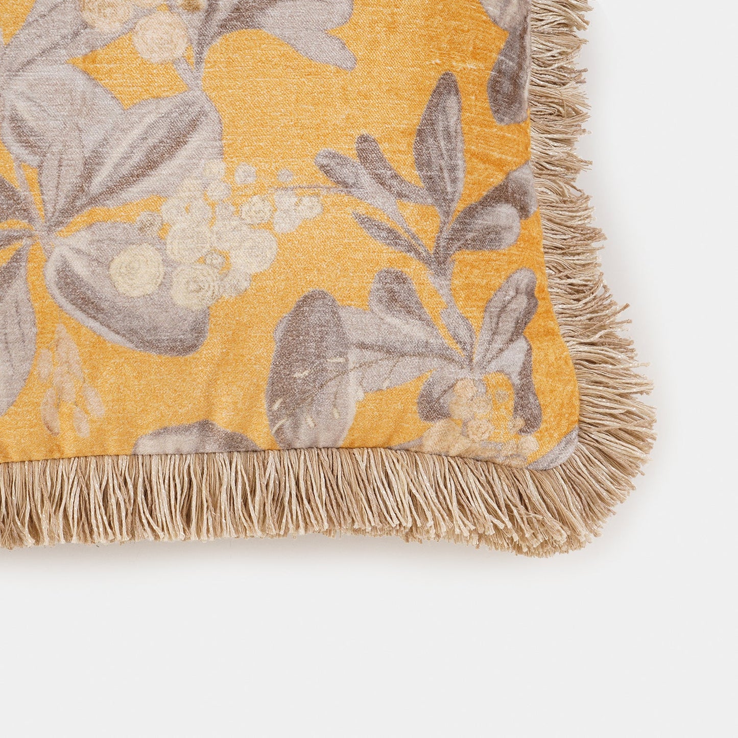 This mustard-yellow cushion cover features a soft velvet finish with an elegant floral pattern in muted tones. The fringed edges add a touch of classic charm, making it a perfect accent for cozy, sophisticated interiors.