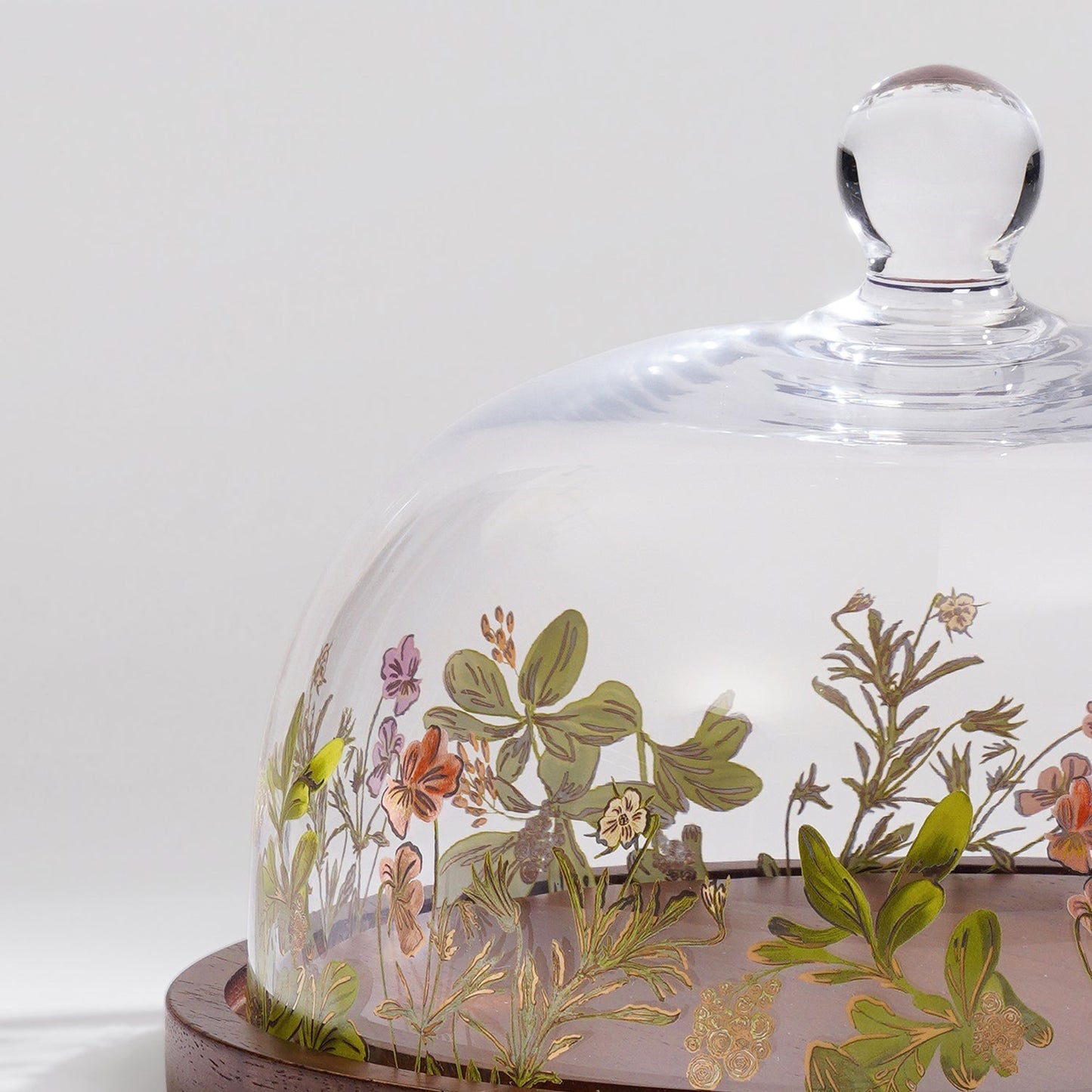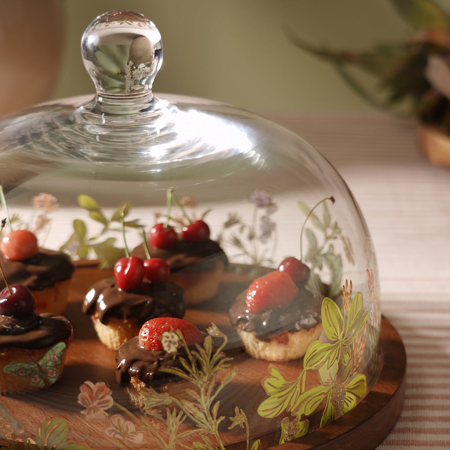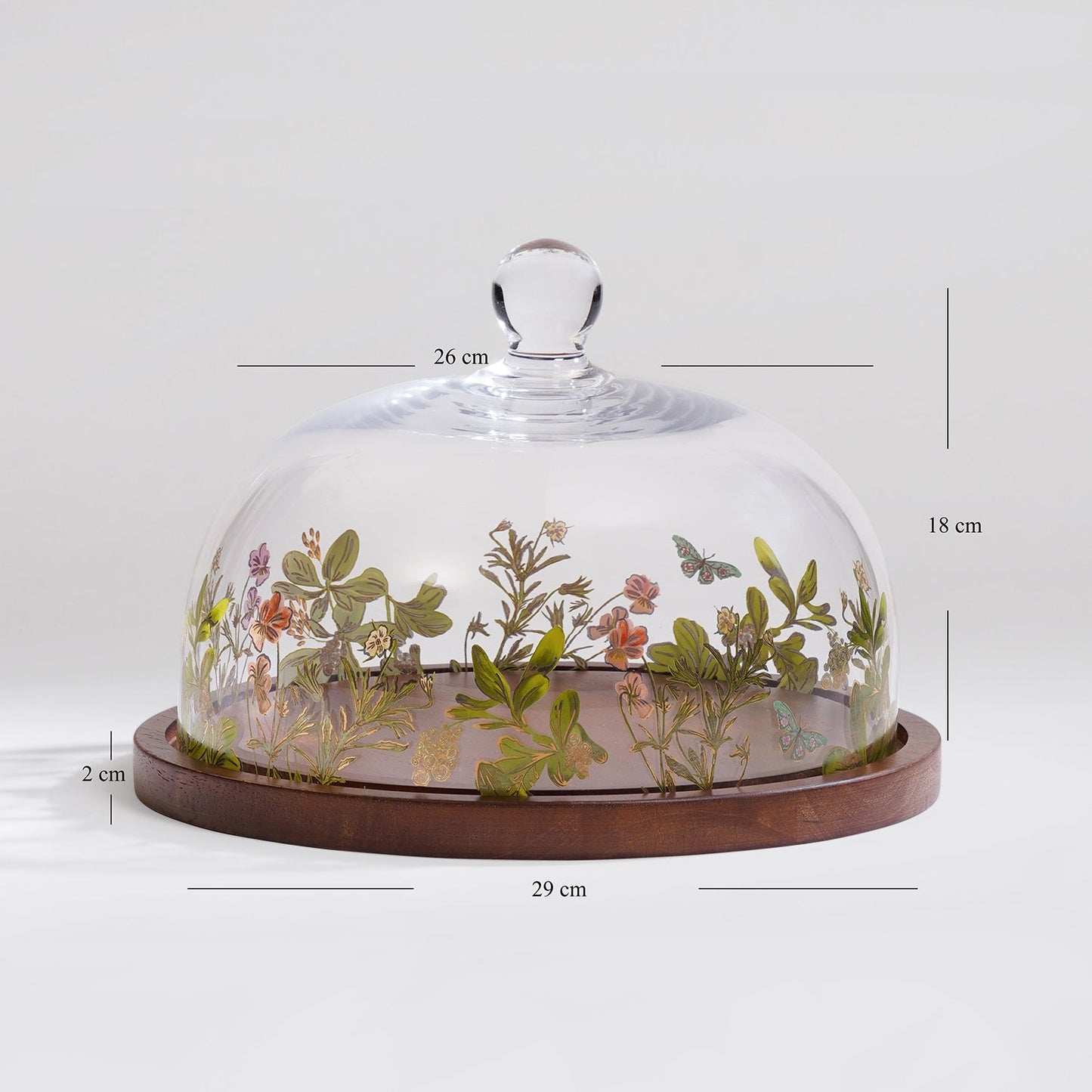 Elevate your serving style with this botanical glass cloche featuring floral and butterfly motifs. Its elegant dome paired with a rich wooden base keeps bakes and cheeses fresh while adding whimsical charm to your table.