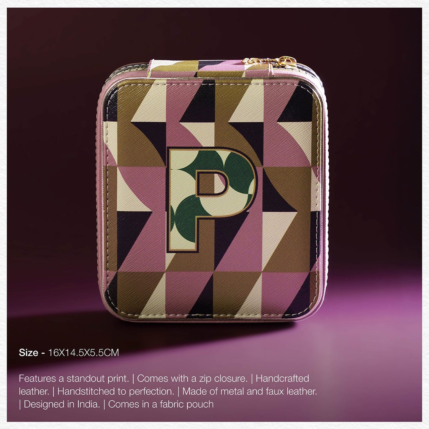 Chic and compact, this pink and green 'I' faux leather jewellery box keeps your treasures safe and tangle-free on the go. Its bold design and secure structure make it the perfect companion for stylish, organized travel.