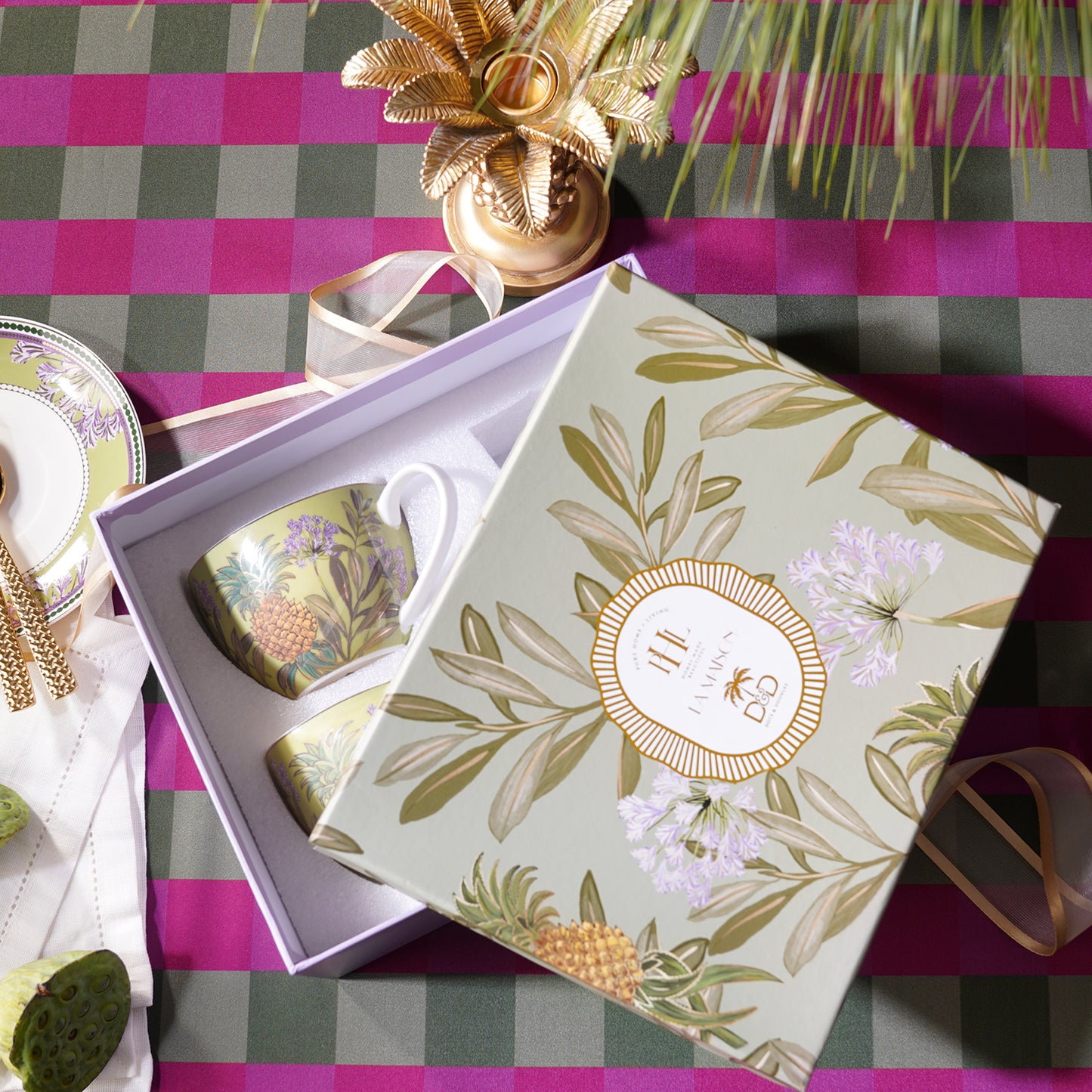 Add Set of 2 Green Pineapple Print Tea Cups & Saucers to the cart