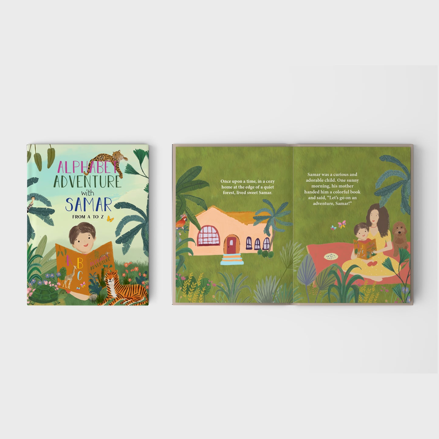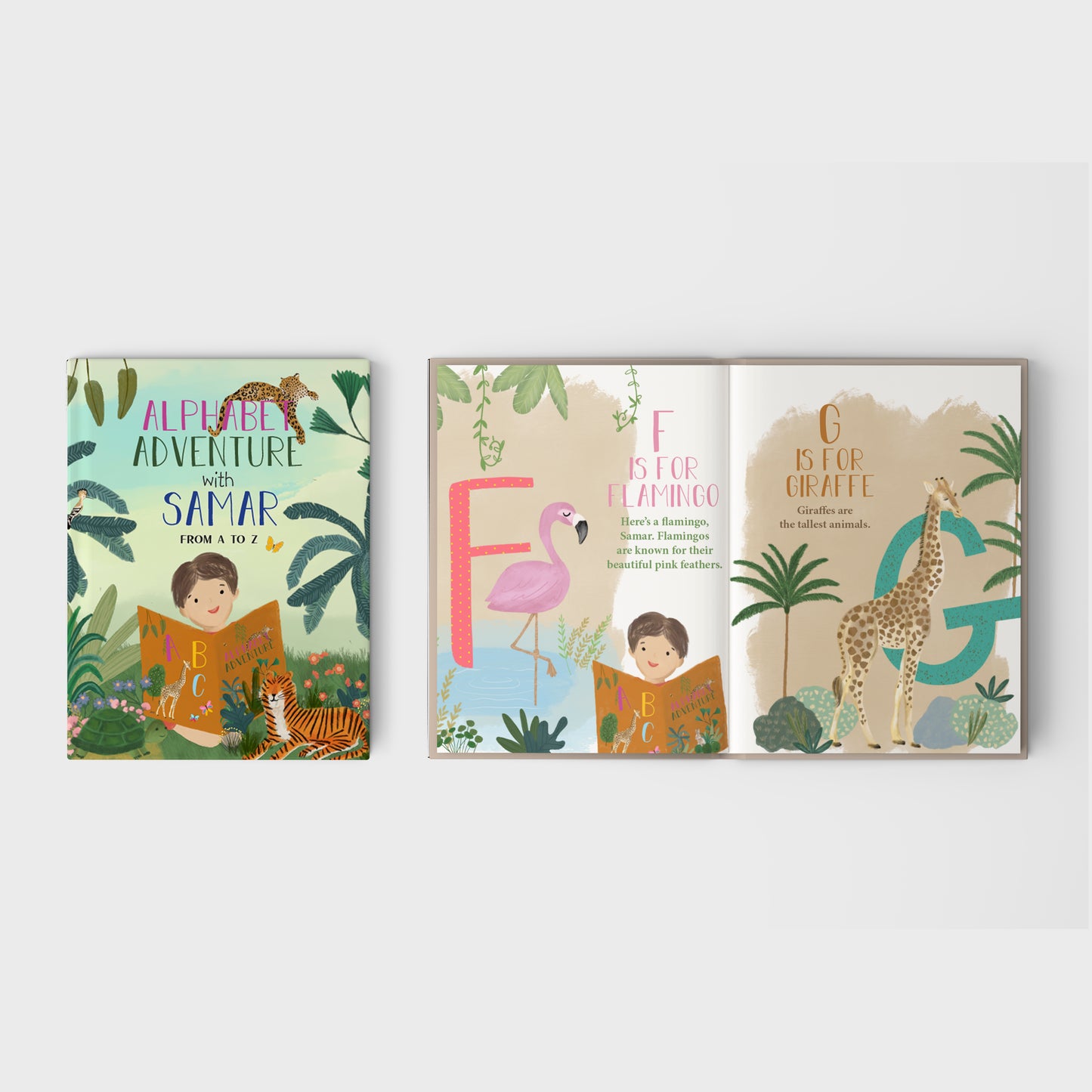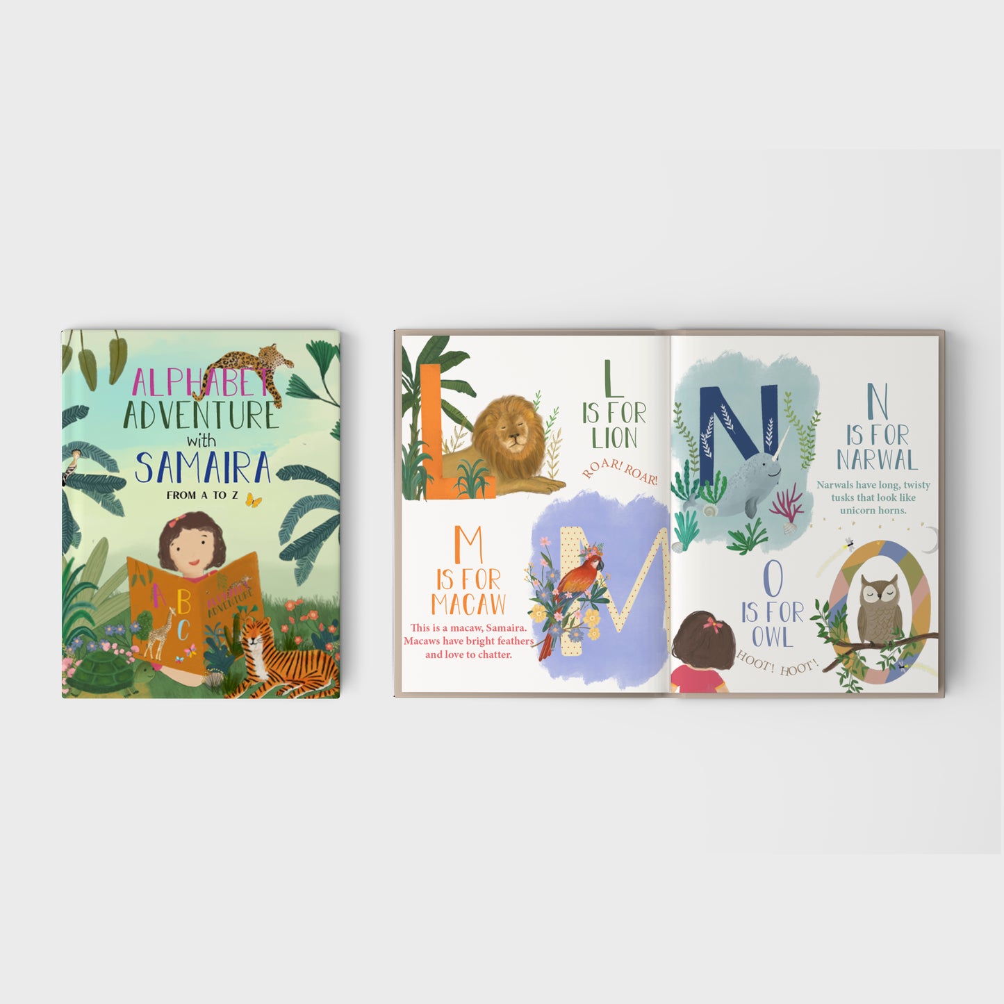 Personalised Alphabet Adventure storybook is beautifully illustrated and personalised with your child's name. The story follows your child on an adventure with animals to learn the Alphabet.