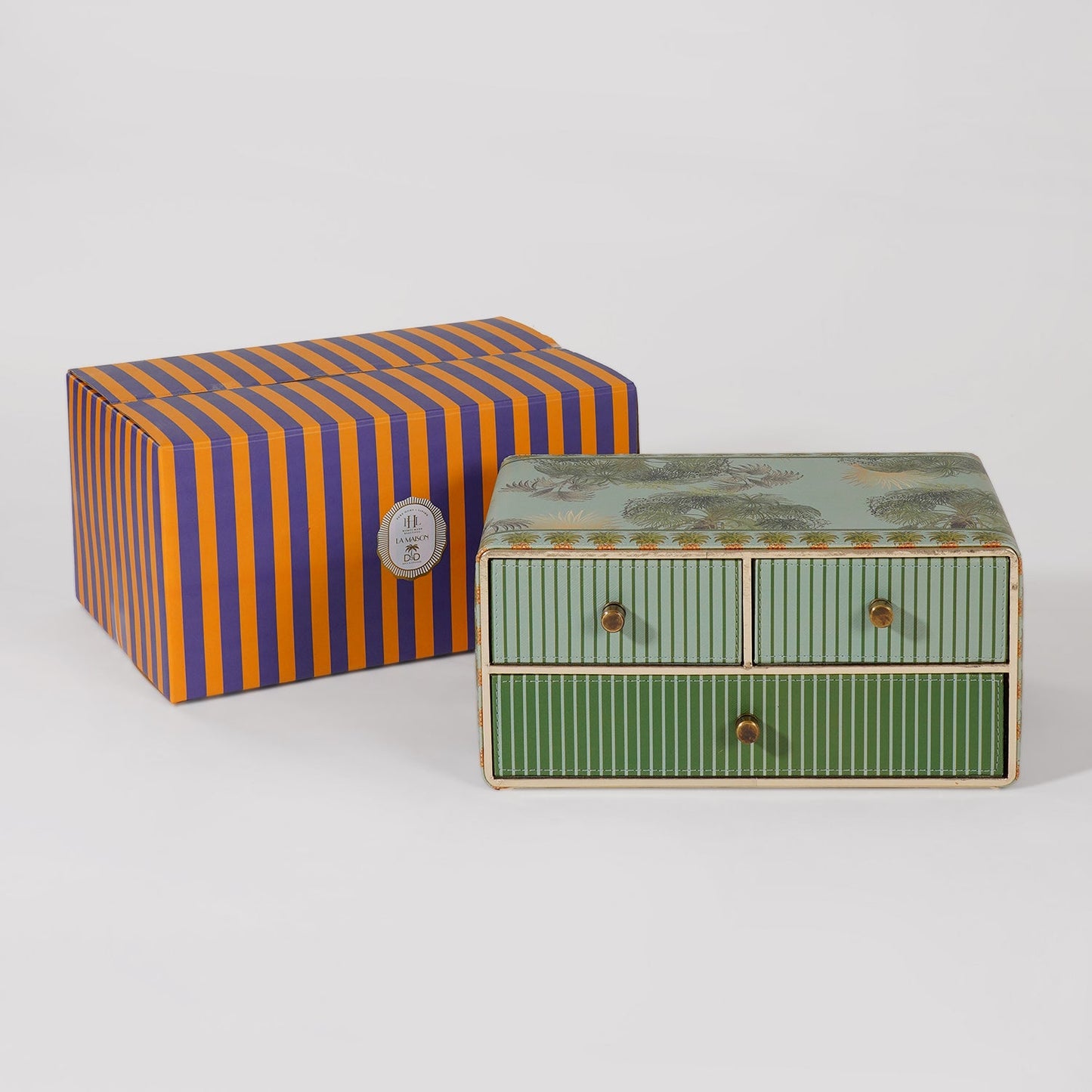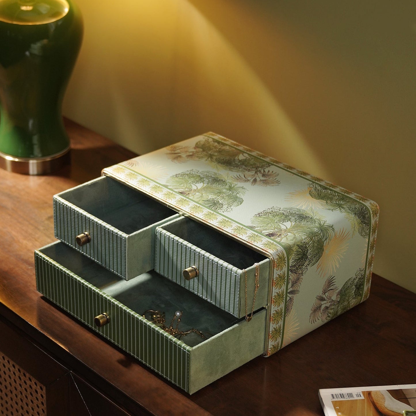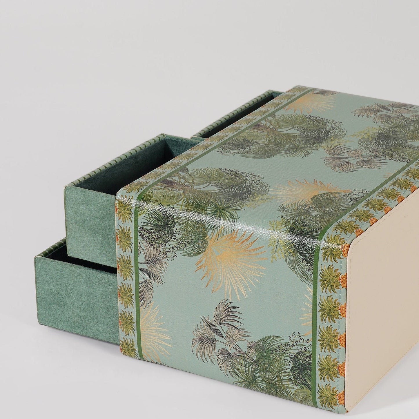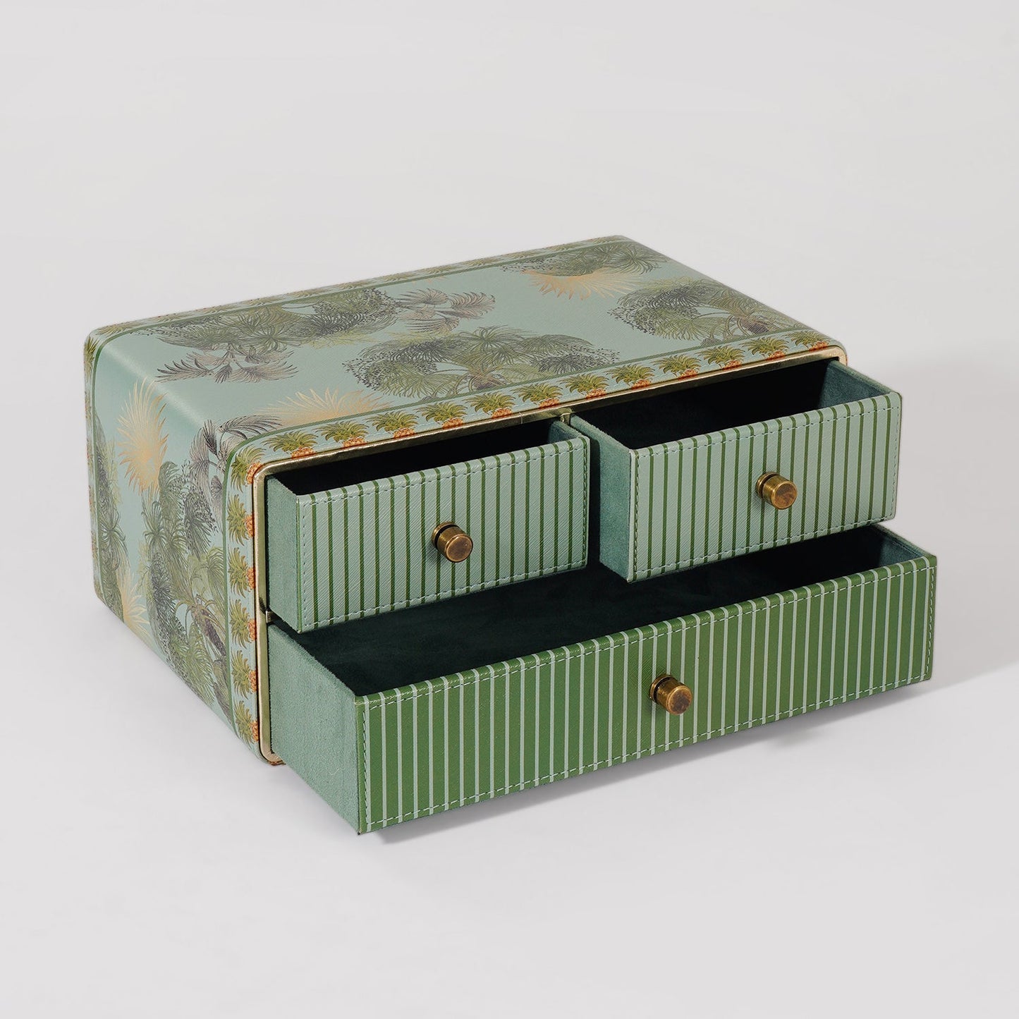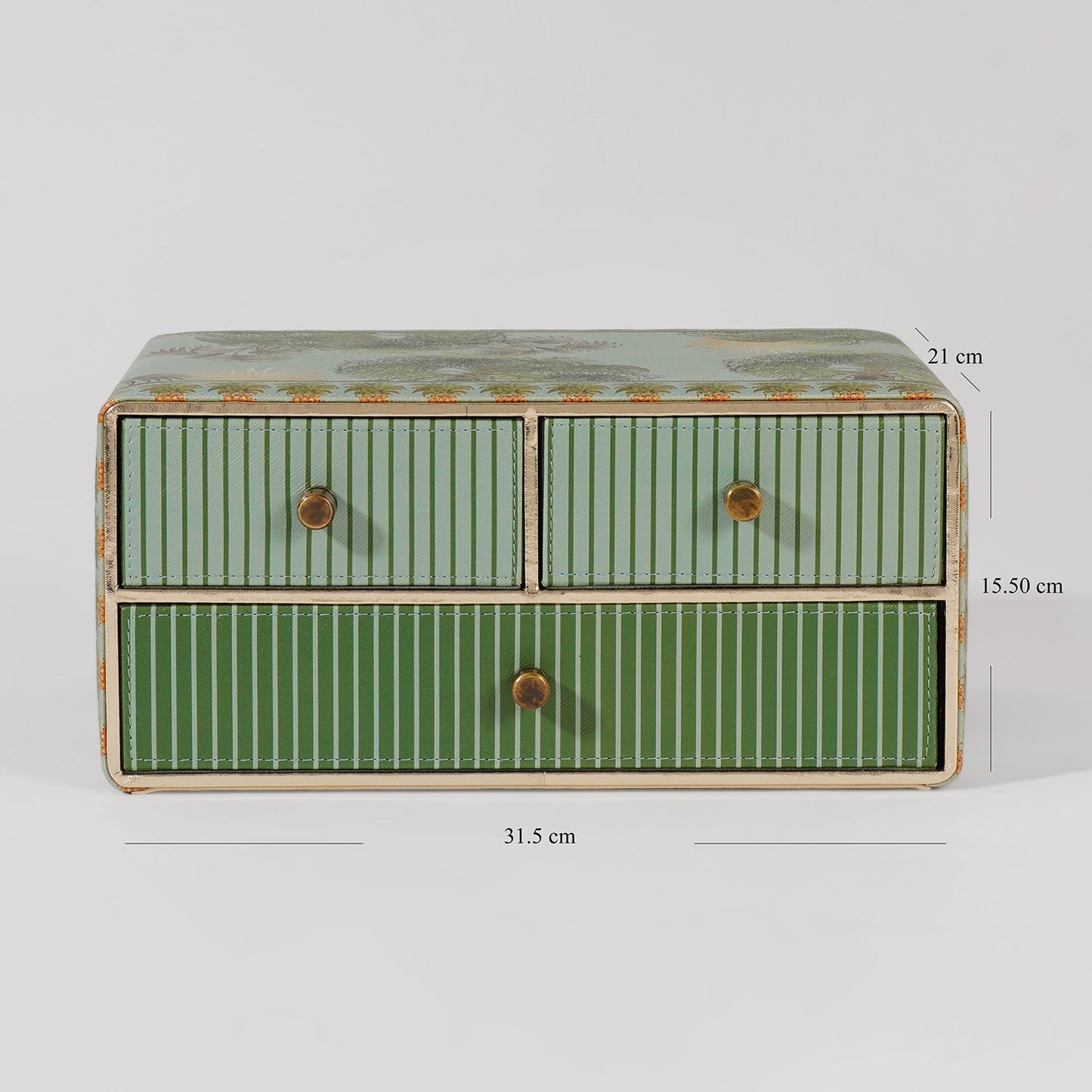 This compact drawer box is adorned with lush tropical motifs and intricate pineapple borders, blending functionality with vibrant elegance. Featuring three striped drawers with vintage-style knobs, it’s ideal for organizing jewelry, stationery, or keepsakes with flair.