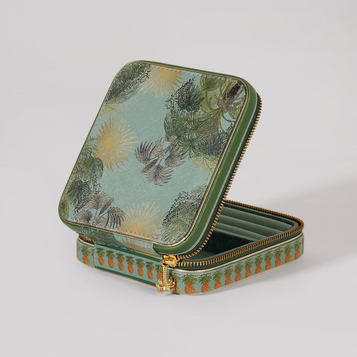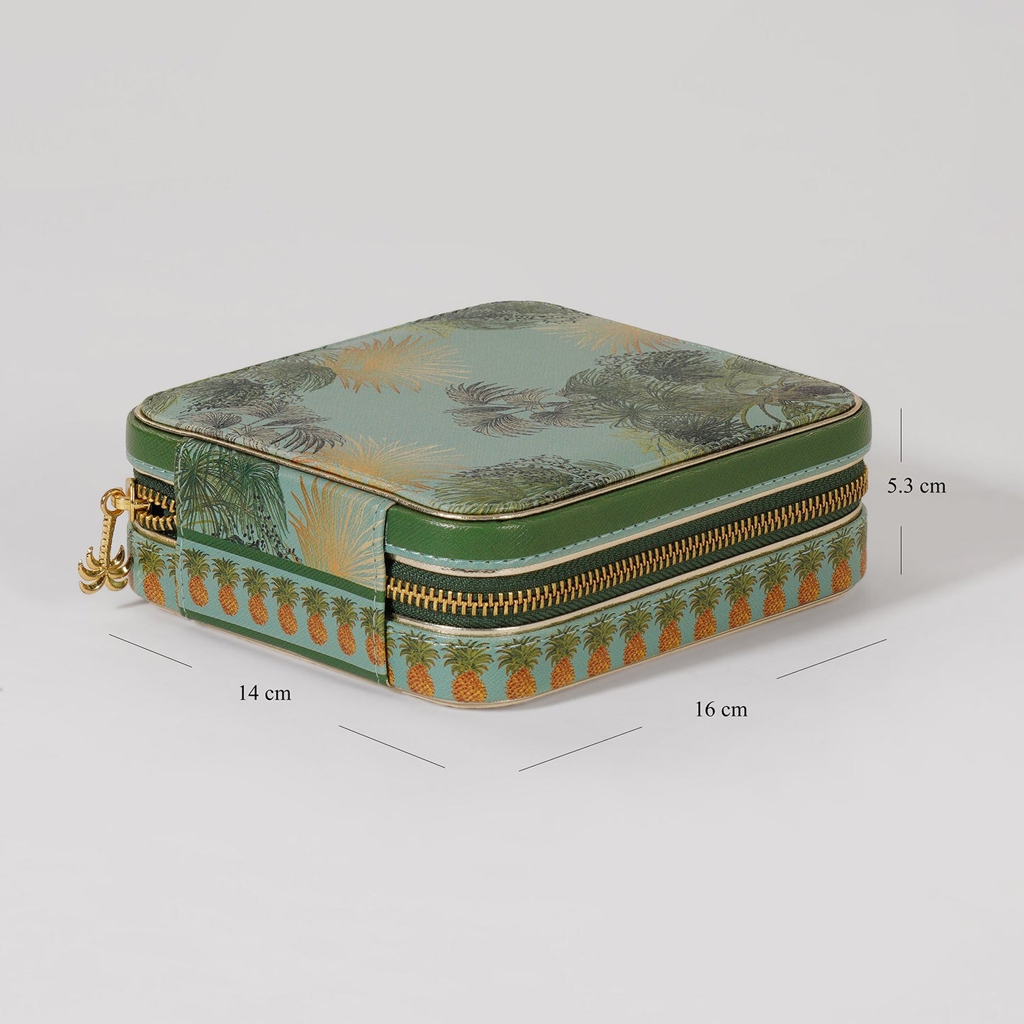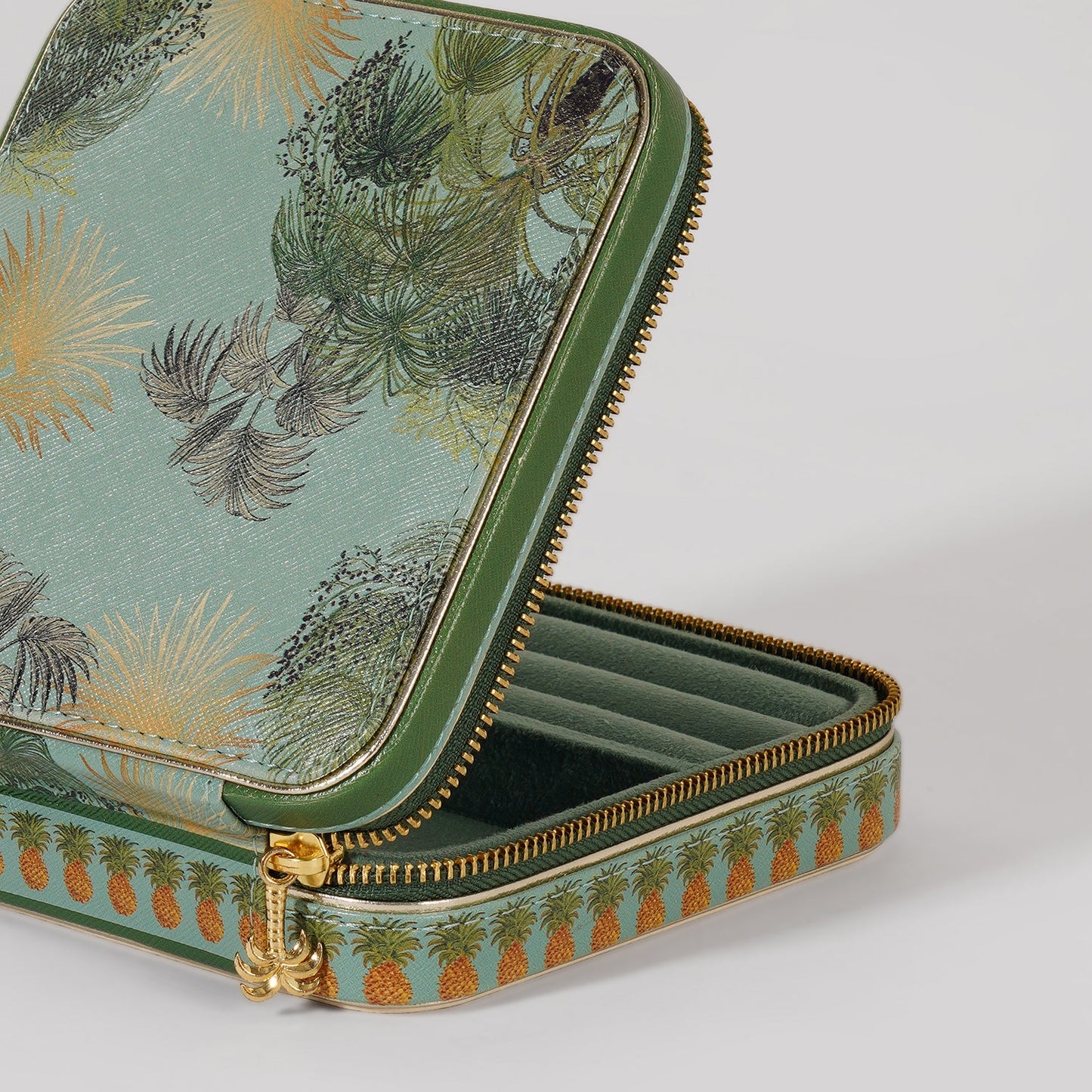 This tropical-themed jewellery case features a luxe palm and pineapple print with a dual-toned body and gold zipper for a sophisticated finish. Its structured design and ample interior space make it ideal for organizing jewelry, cosmetics, or keepsakes in style.
