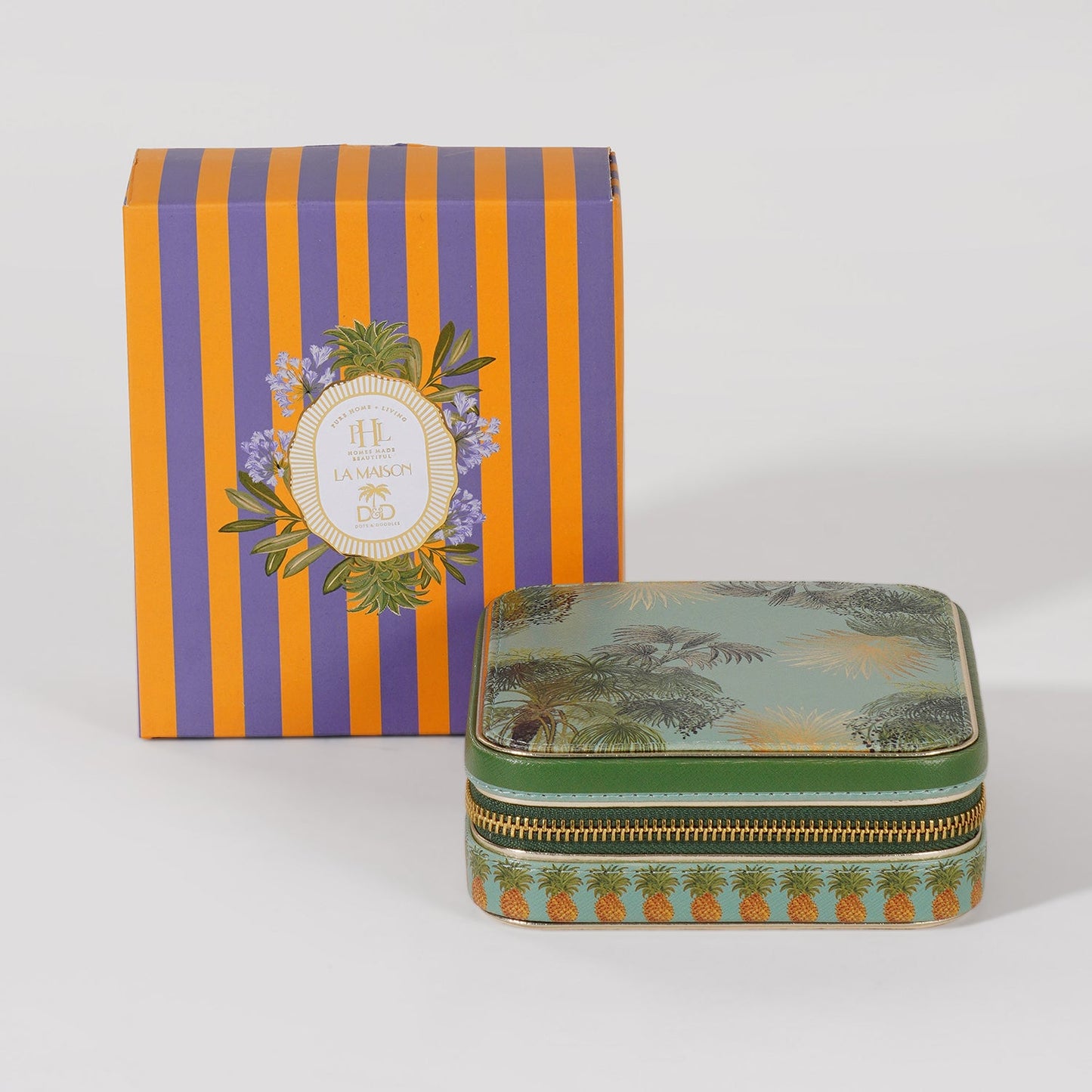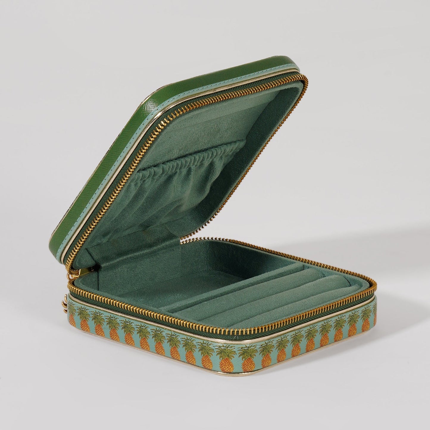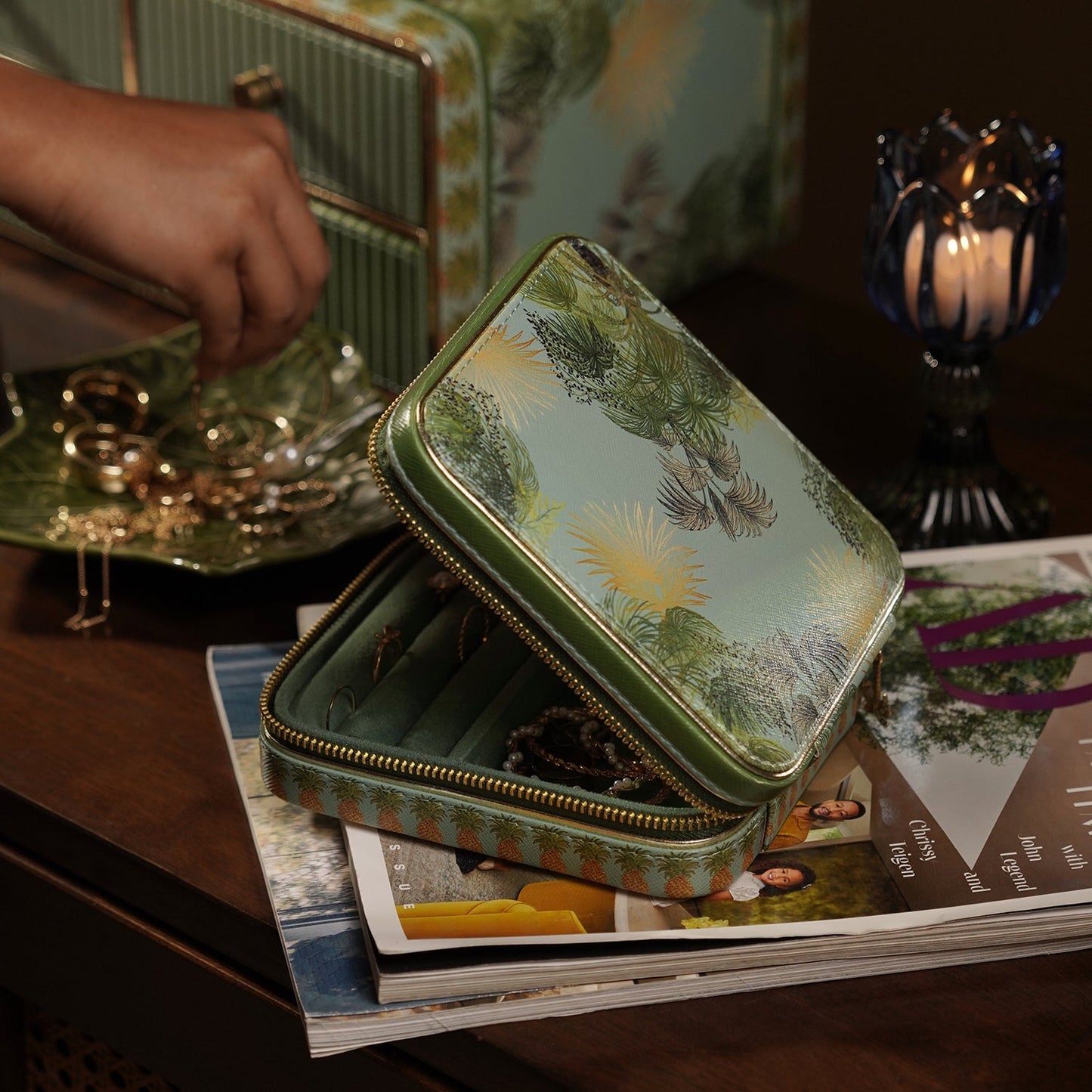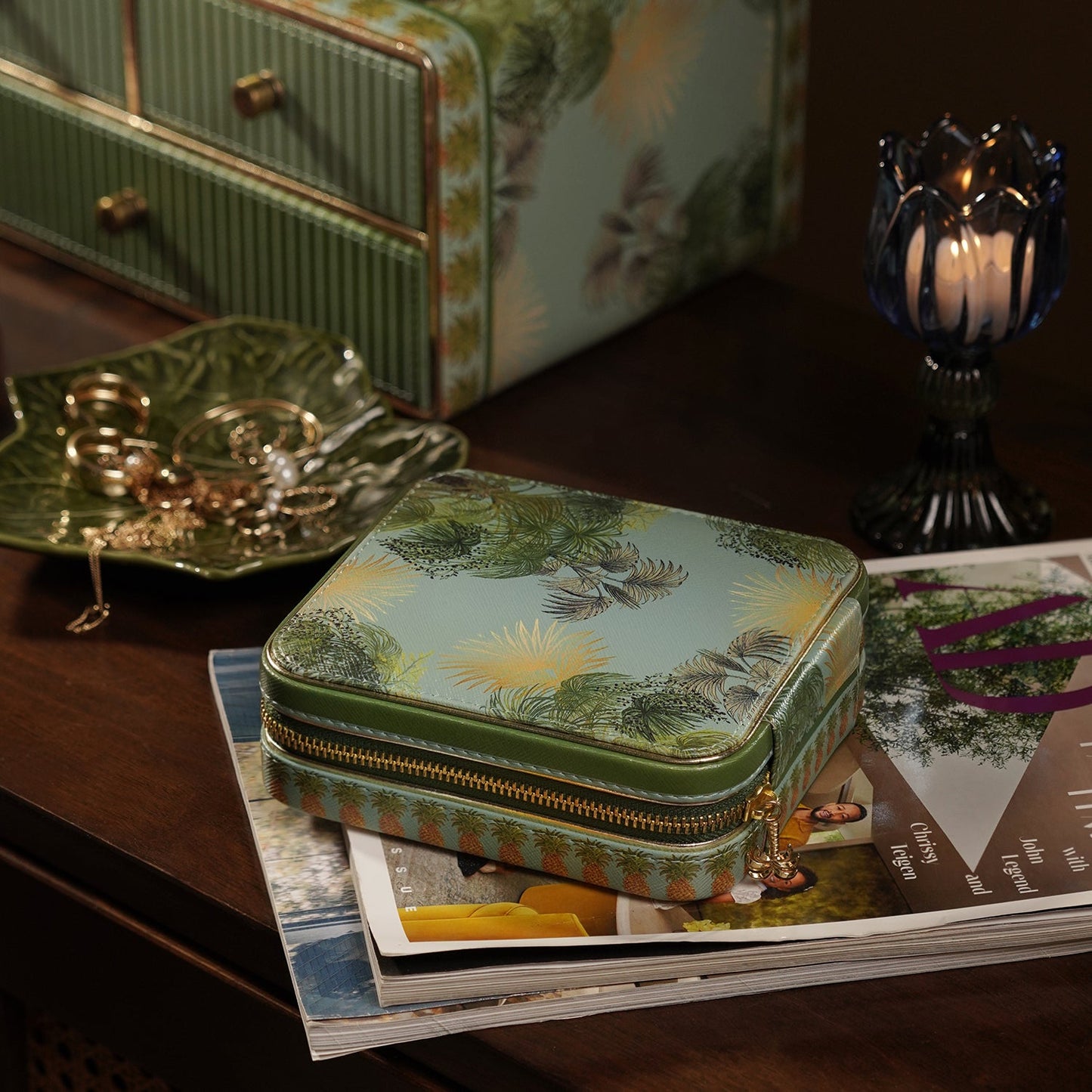 This tropical-themed jewellery case features a luxe palm and pineapple print with a dual-toned body and gold zipper for a sophisticated finish. Its structured design and ample interior space make it ideal for organizing jewelry, cosmetics, or keepsakes in style.