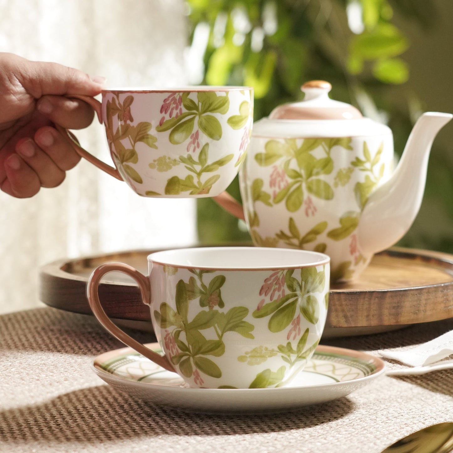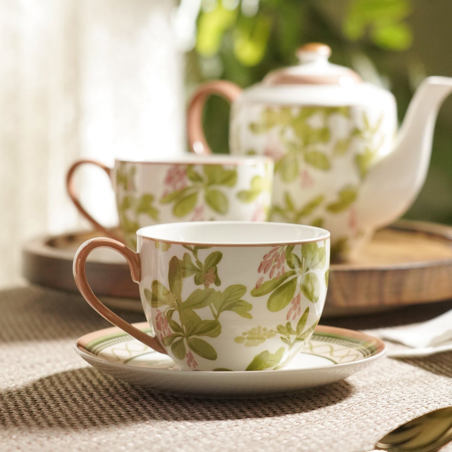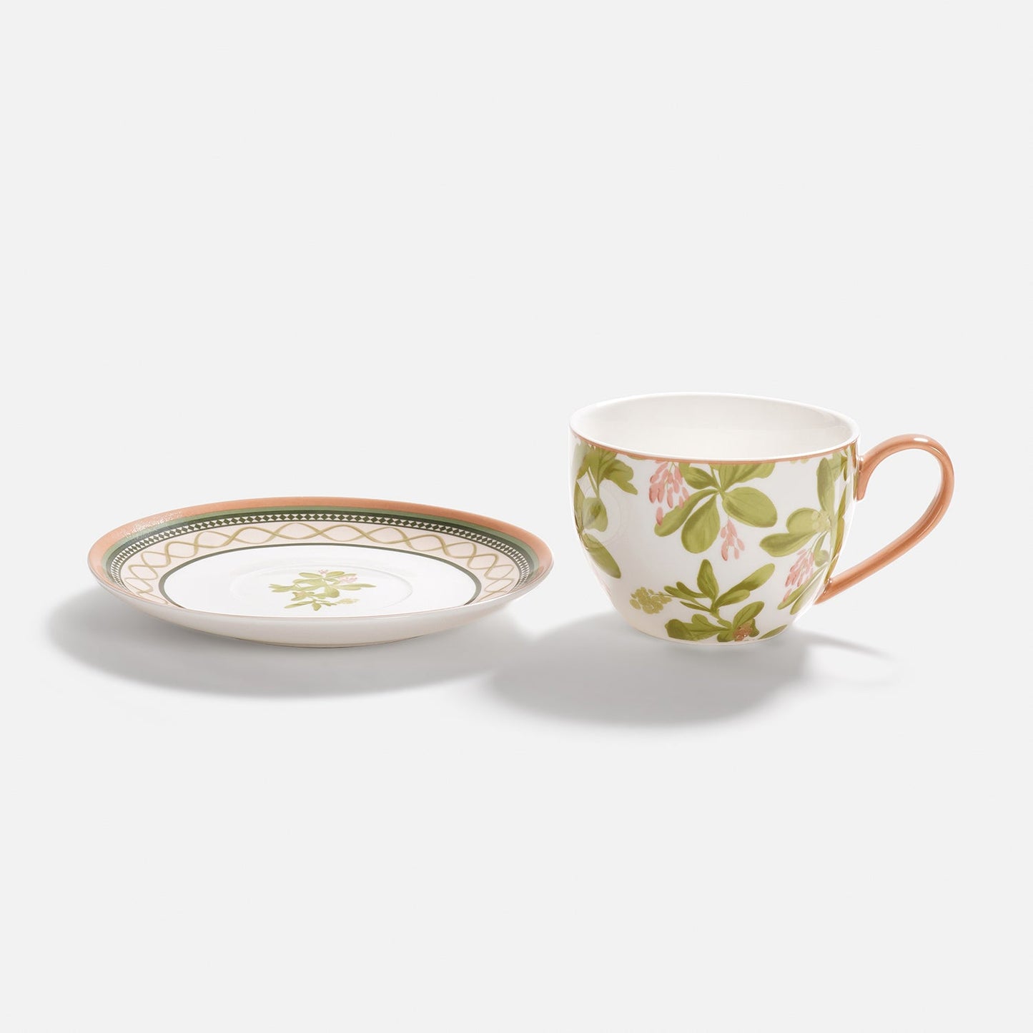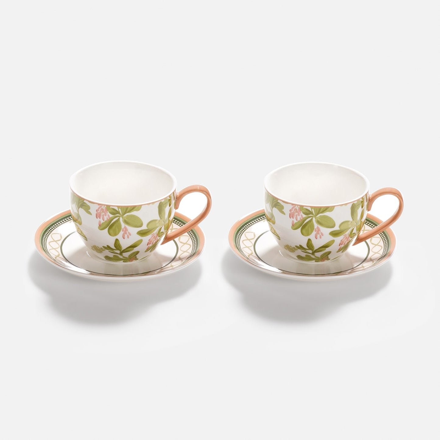 Set of 2 Pink Printed Bone China Tea Cups & Saucers