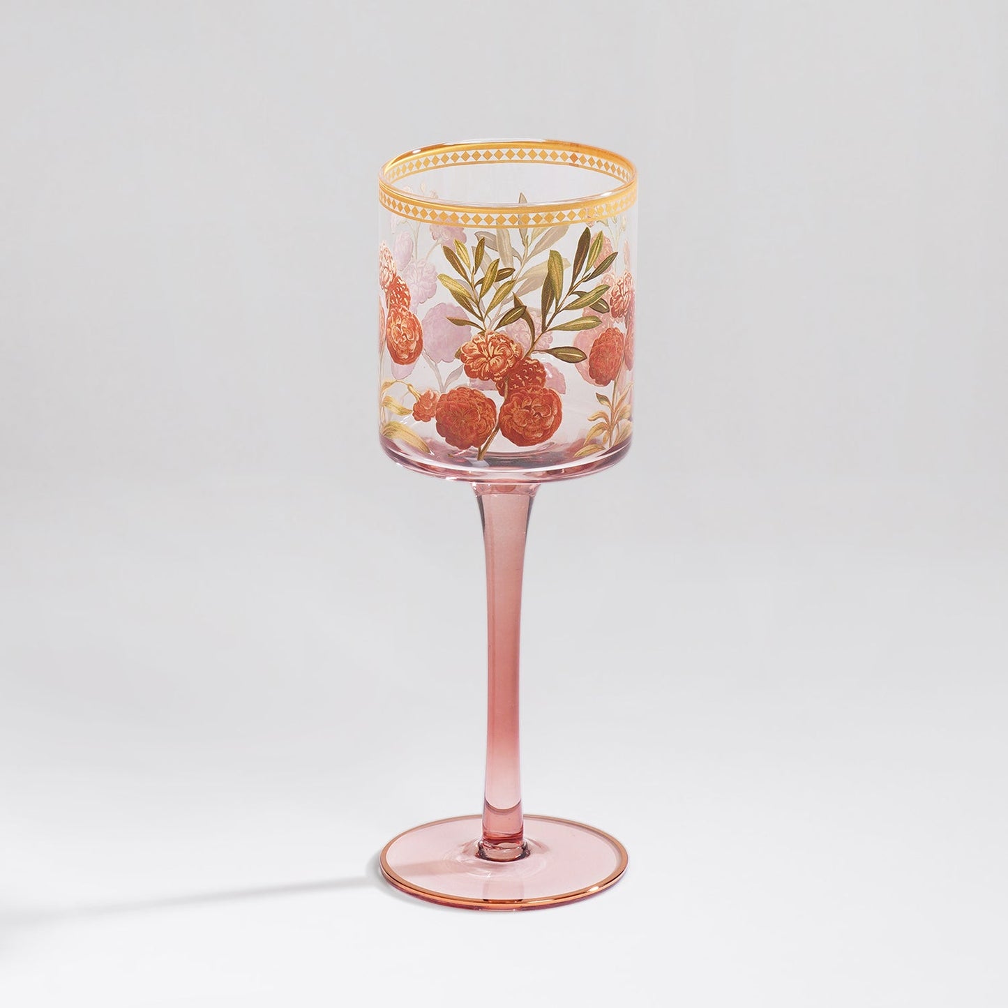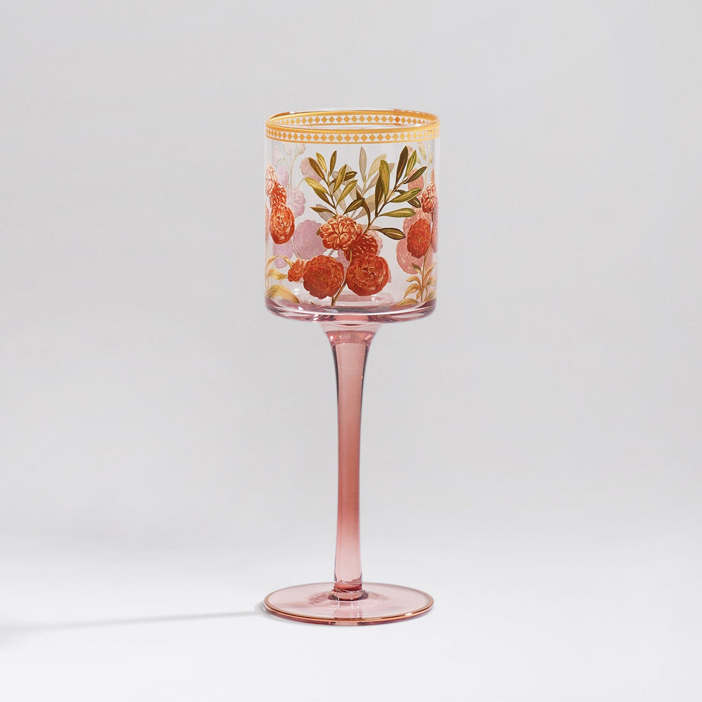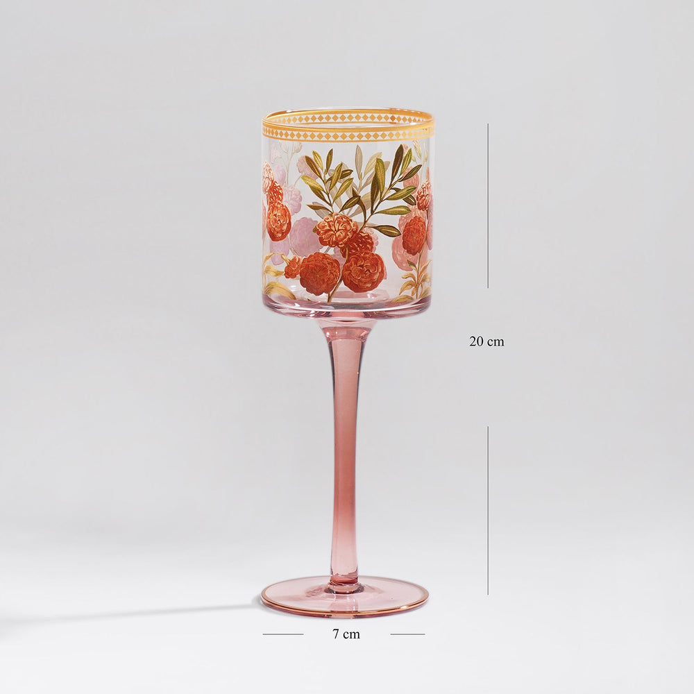Elevate your tablescape with this elegant glass stem candle holder featuring intricate golden floral and foliage motifs.
