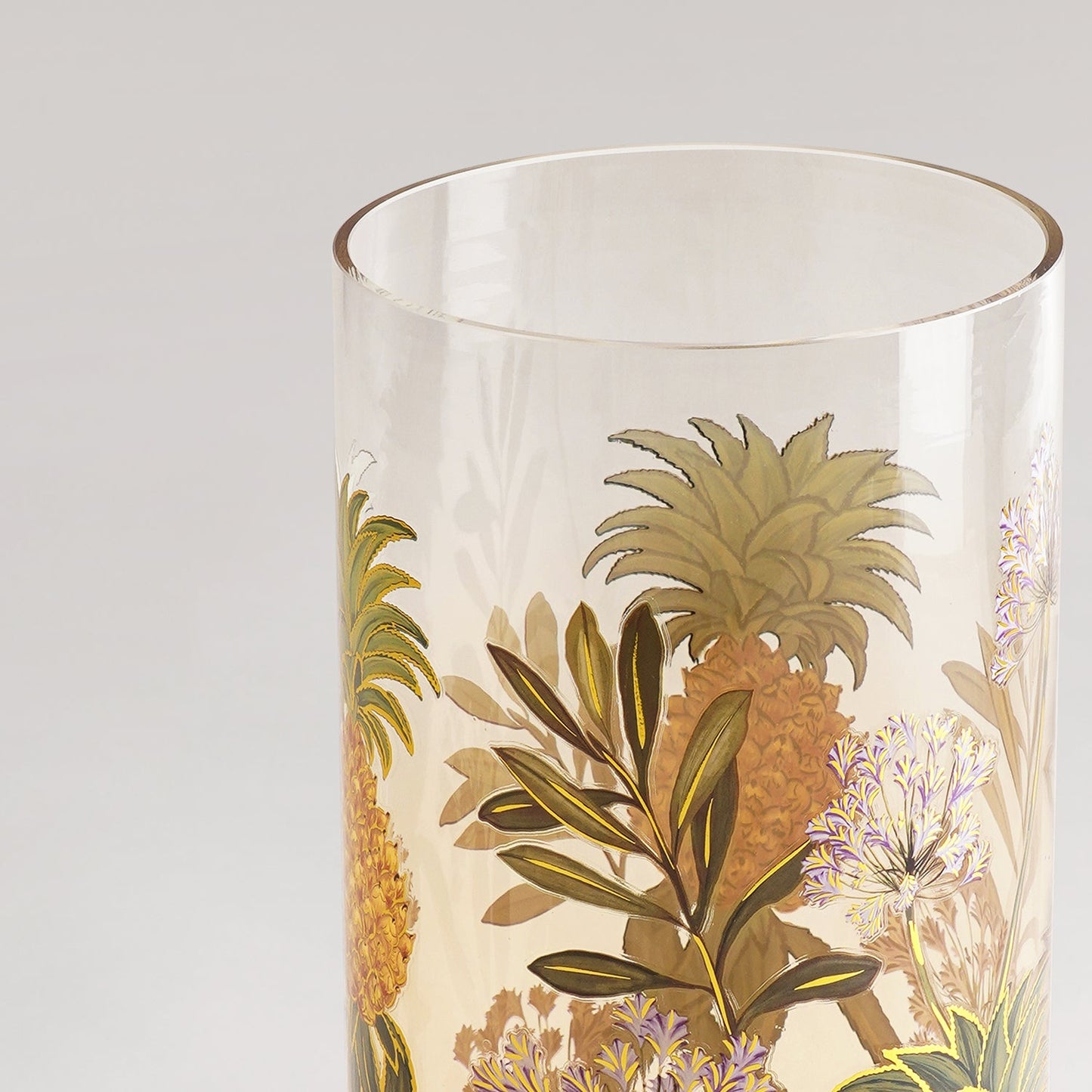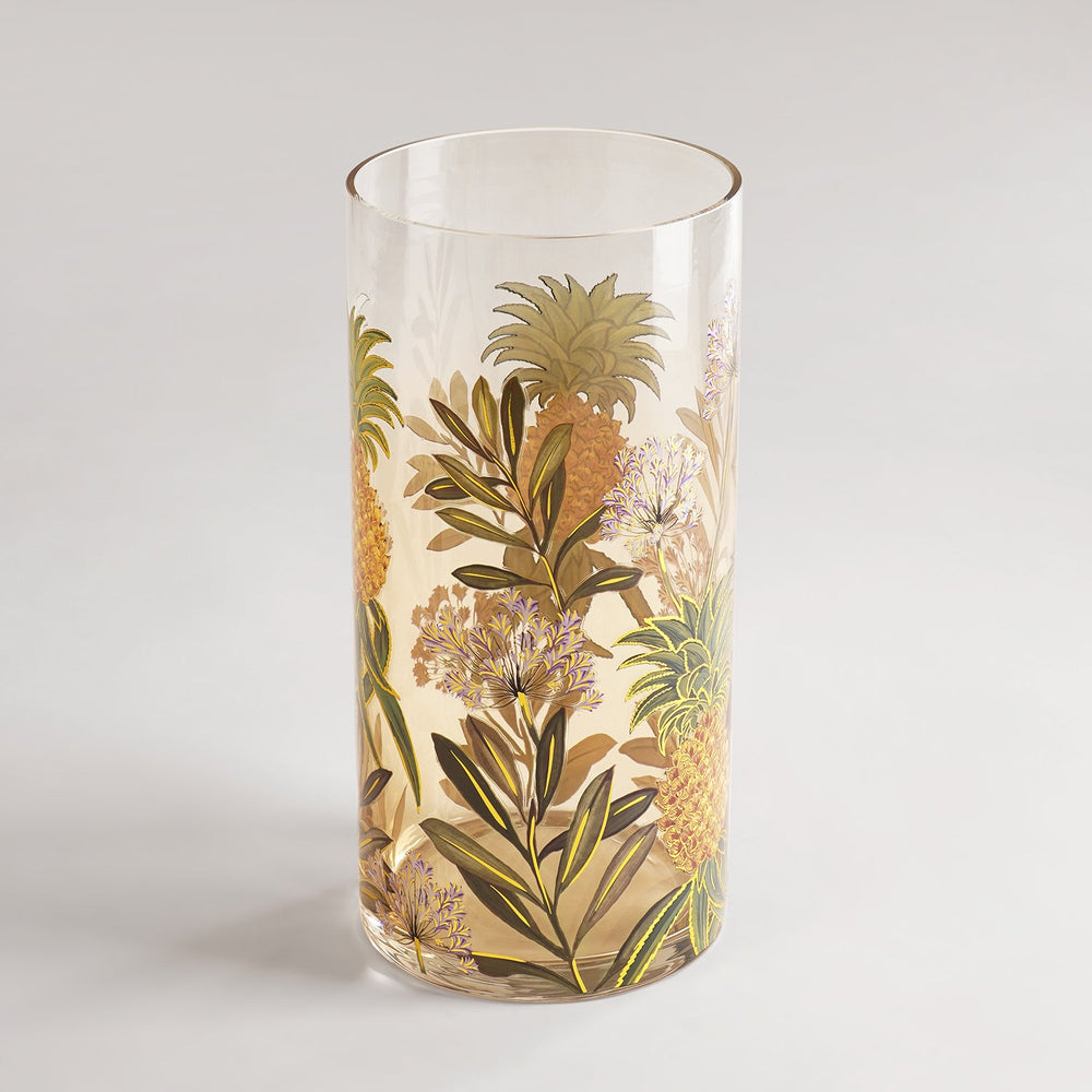 This stunning green cylindrical vase is adorned with intricate gold botanical motifs for an elegant finish. Its refreshing floral design adds a pop of colour and sophistication to your table, console, or festive decor.