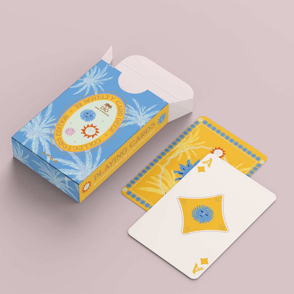 Introducing Sol y Palmas Playing Cards Set, exquisite ensembles of 52 uniquely designed cards, each set accompanied by 2 unique jokers. The Palmas Deck boasts a retro palette of blue and green, featuring artistic palm illustrations. Meanwhile, the Sol Deck, adorned in blues and yellows, showcases captivating sun impressions. Both sets evoke a delightful sense of nostalgia and playfulness, transforming every game into a timeless adventure.