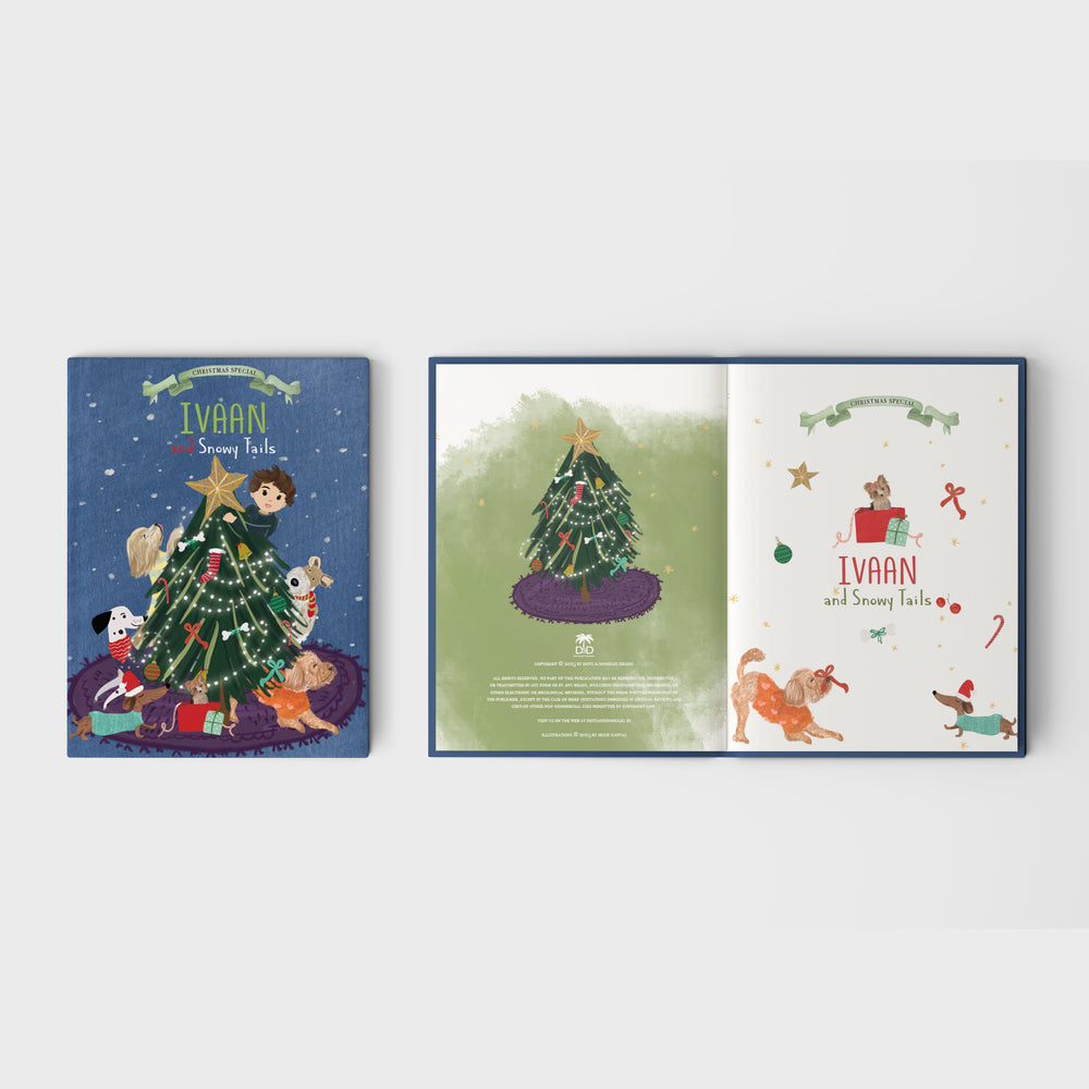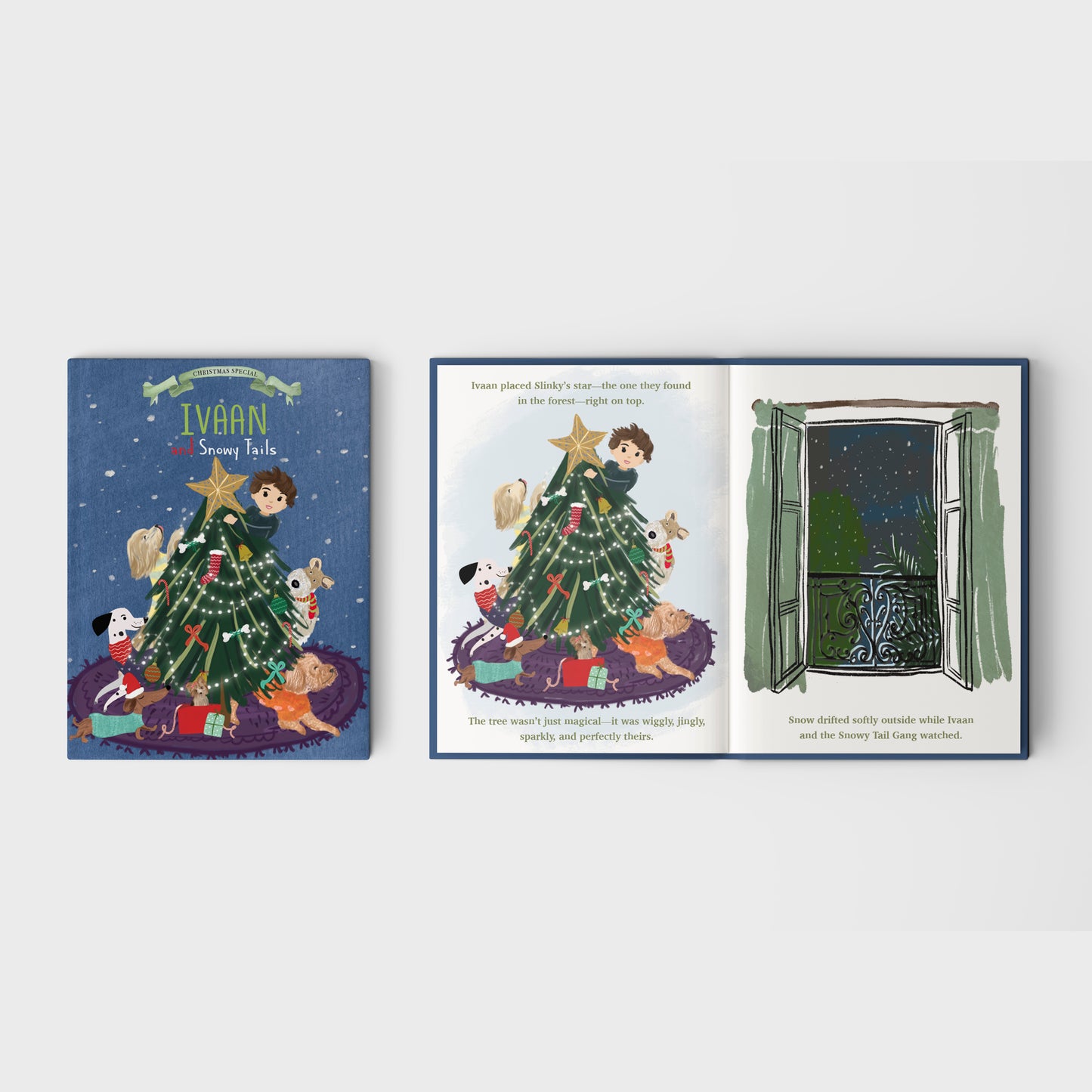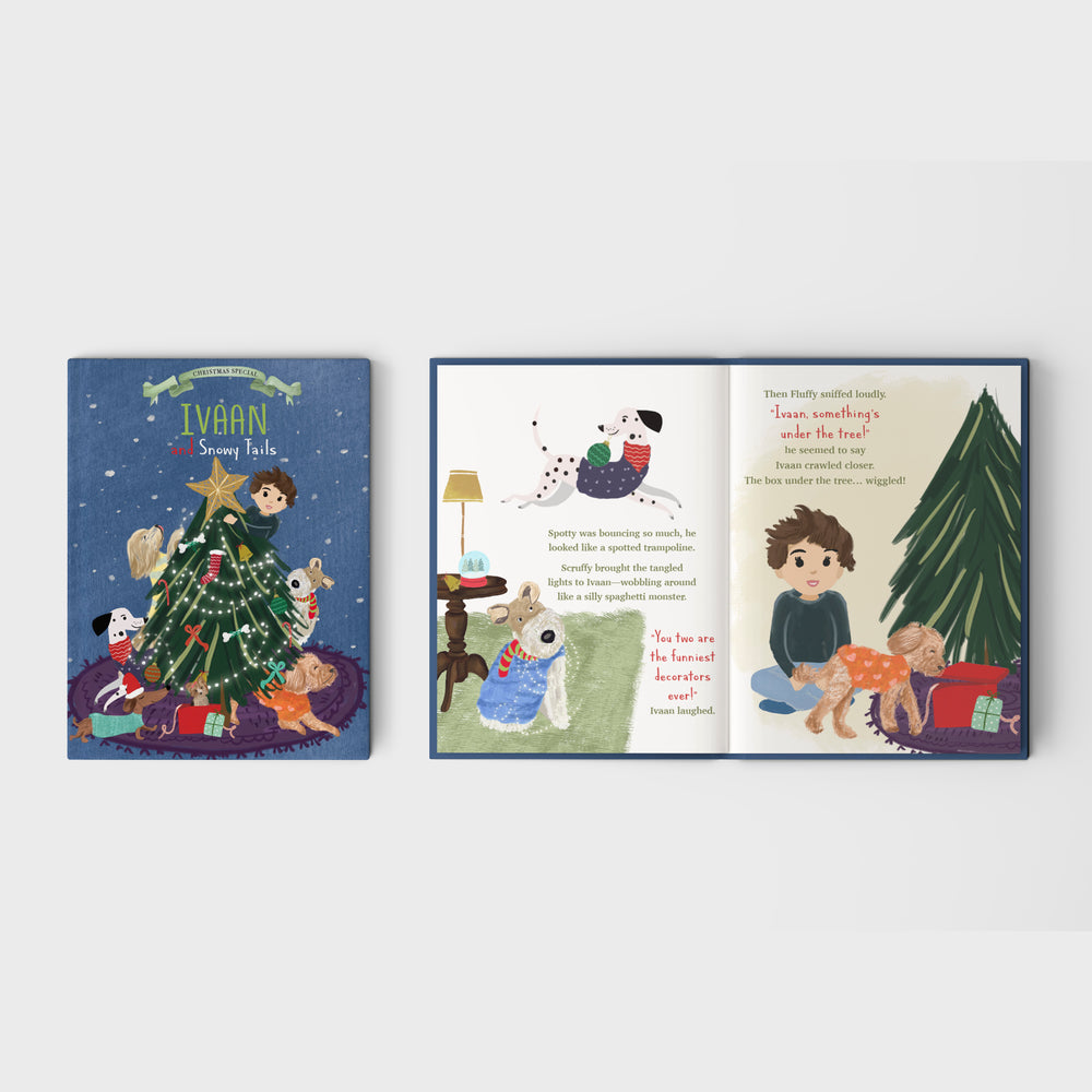 Snowy Tails is a beautifully illustrated personalised story book that puts your child at the centre of a magical Christmas adventure. Filled with festive charm, the story follows your child and a gang of fluffy, friendly dog friends as they search for the perfect Christmas tree and decorate it together in the most joyful, tail-wagging way.