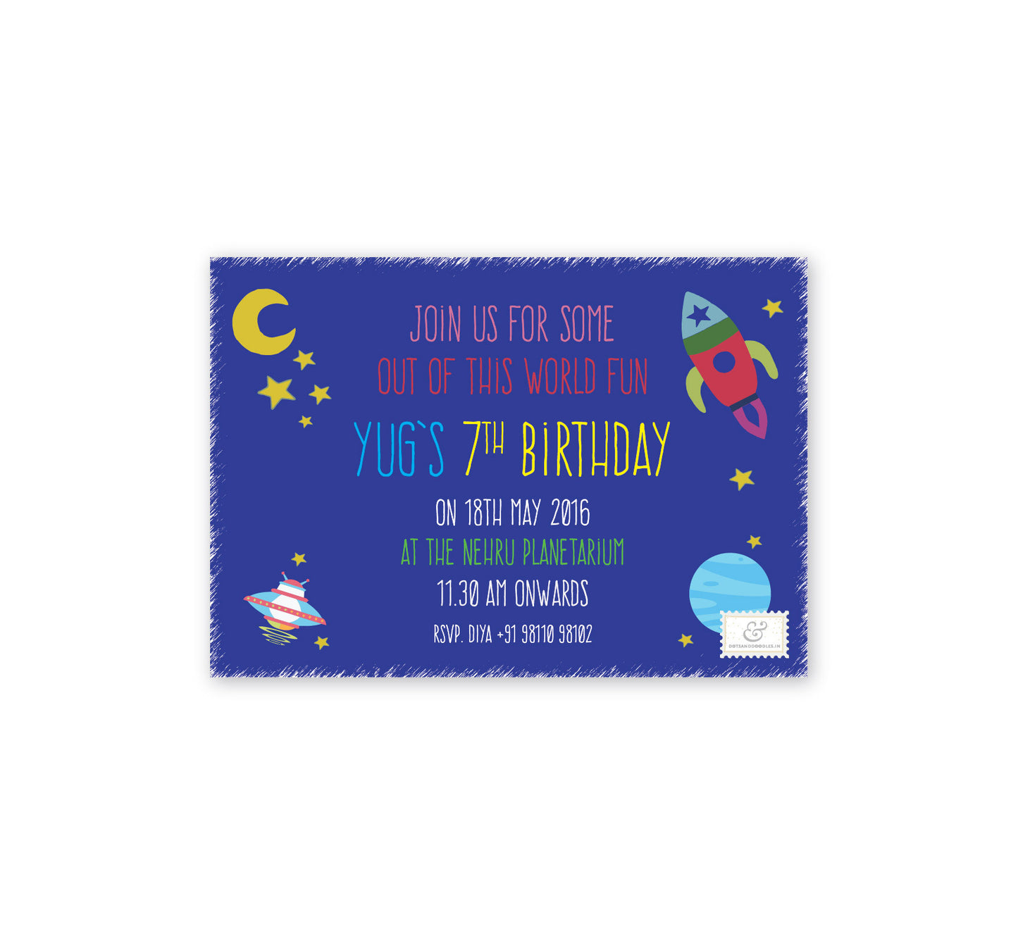Kick off your Space Party in style with this customised birthday party invitation. Use the digital cards to send E-invites from your mobile or get your own set of beautiful printed invitations.
