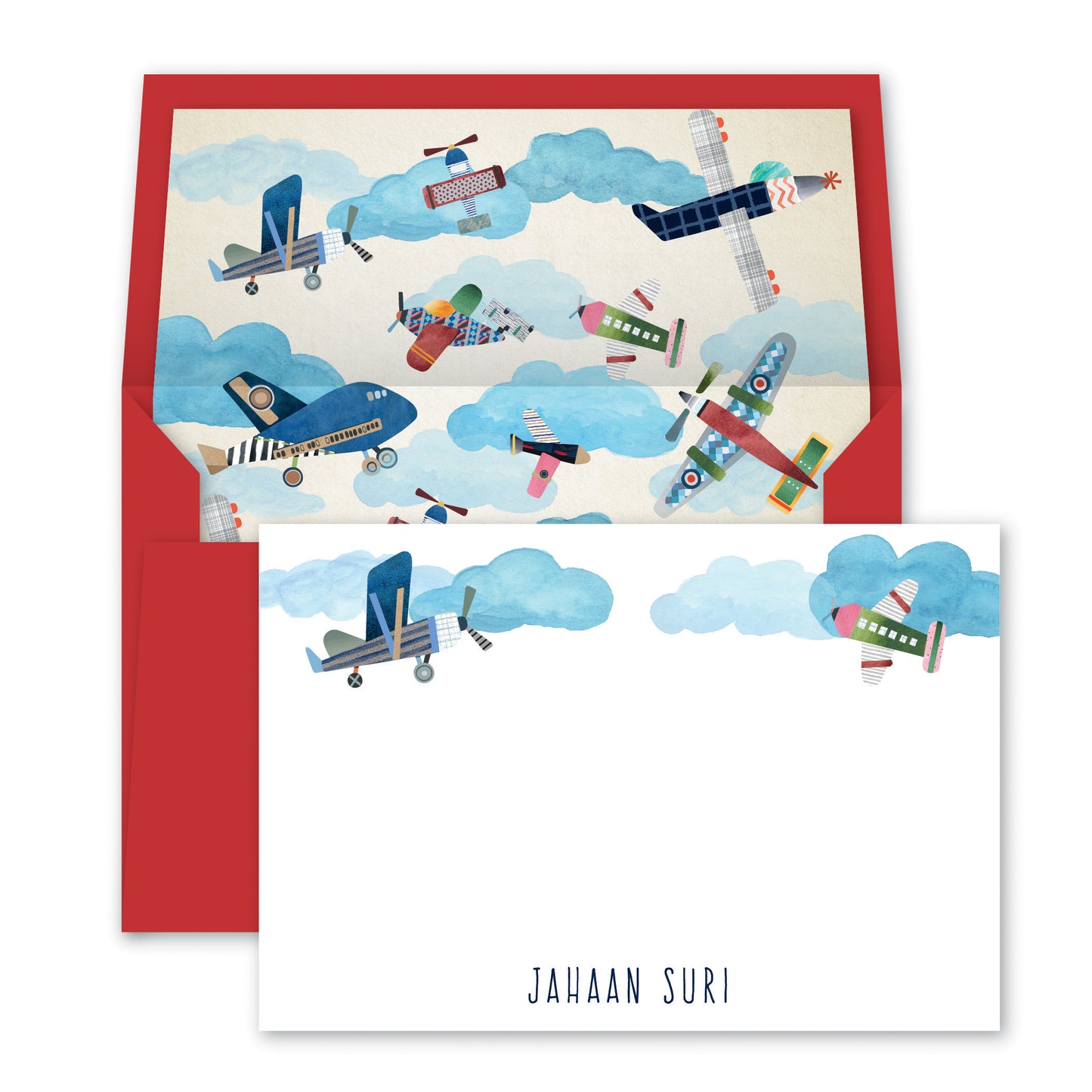 Sky Ride personalised set of boxed notecards paired with lined envelopes, illustrated with vintage airplanes in cool patterns. These fun notecards can be used to send a greeting or as thank you, and even make a great gift.