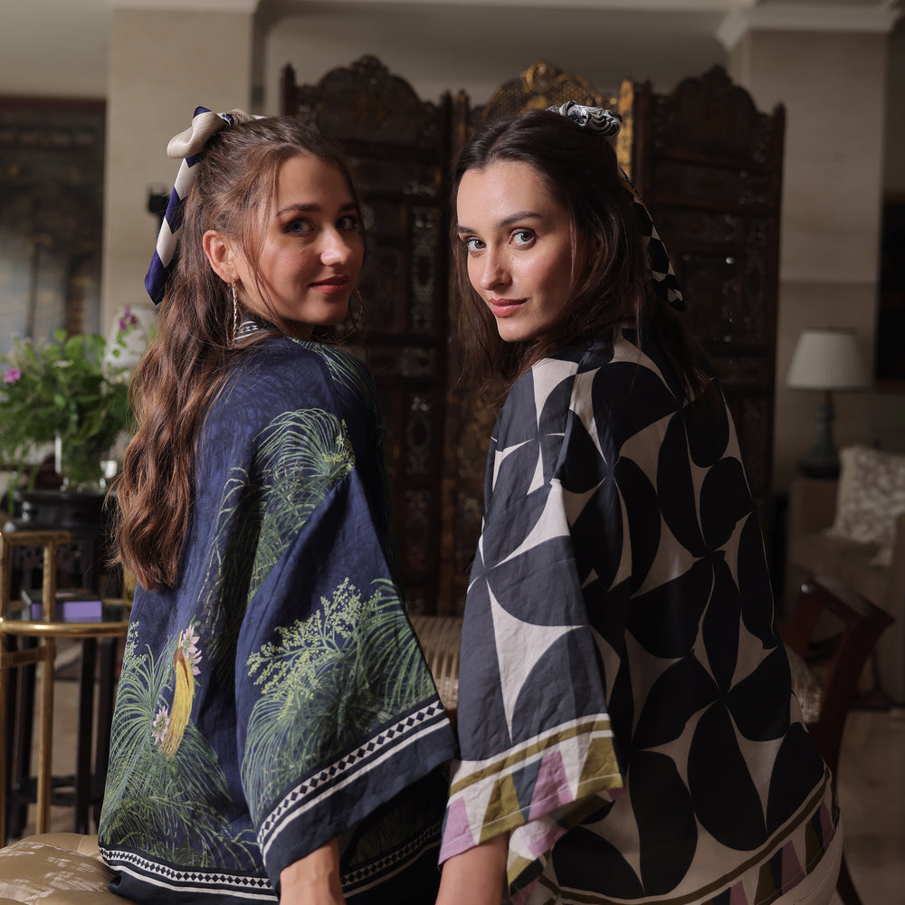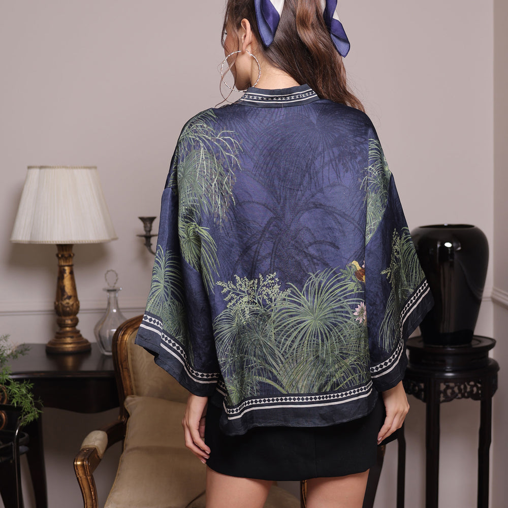 The Bergamo print captures a serene scene with its blue base adorned with delicate foliage and bird motifs, elegantly framed by a classic black and white border. Perfect for adding a touch of nature-inspired charm to any outfit.
