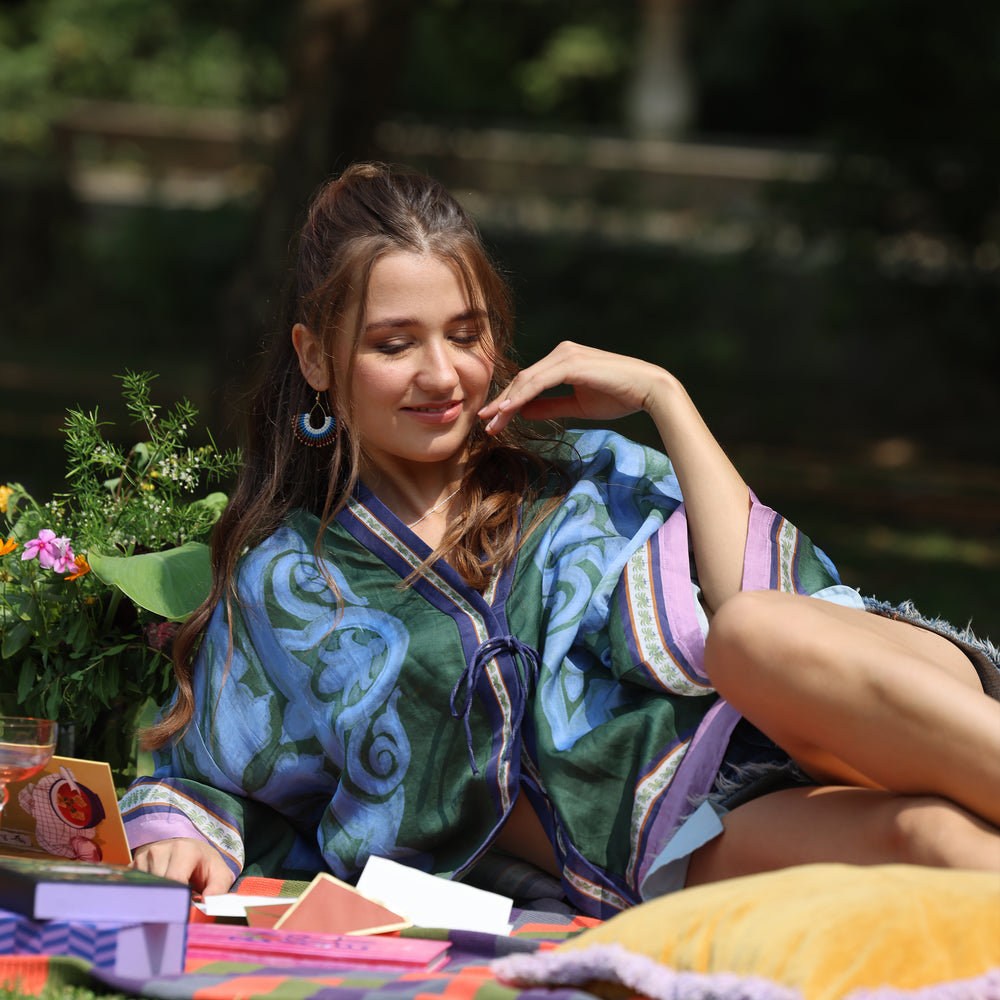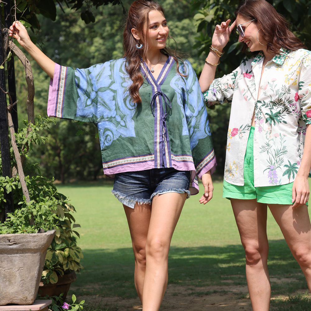 The Palmas print features a green base adorned with blue motif and a palm tree, elegantly bordered in mauve and detailed border, adding a touch of natural charm to any outfit.
