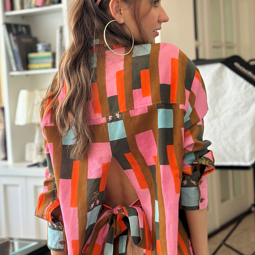Say hello to your new favourite: the Button Down Bow Shirt. Made from comfy cotton poplin, this shirt features an inside belt that ties into a cute bow, giving the classic button-down a fun twist. With the over-sized fit, the belt helps contour your body for a flattering fit, and the back slit adds a bit of flair. Perfect for all your plans this season, this shirt is all about living la dolce vita this summer with style and ease.