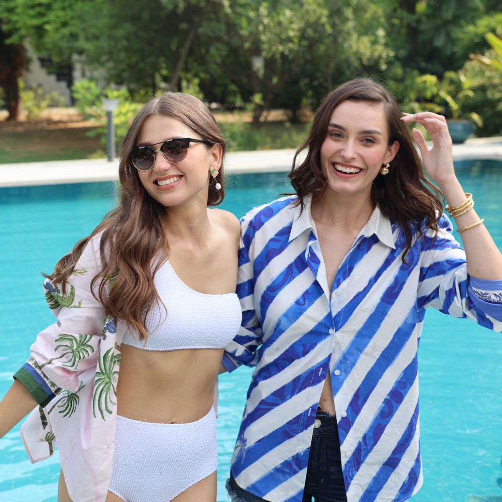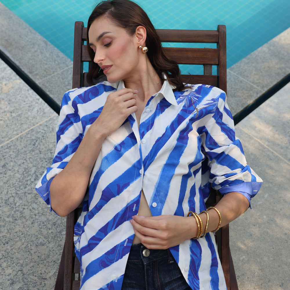 The Positano print features blue stripes and palm motifs, capturing the breezy vibe of an Italian summer. Perfect for adding a touch of Mediterranean charm to your wardrobe.