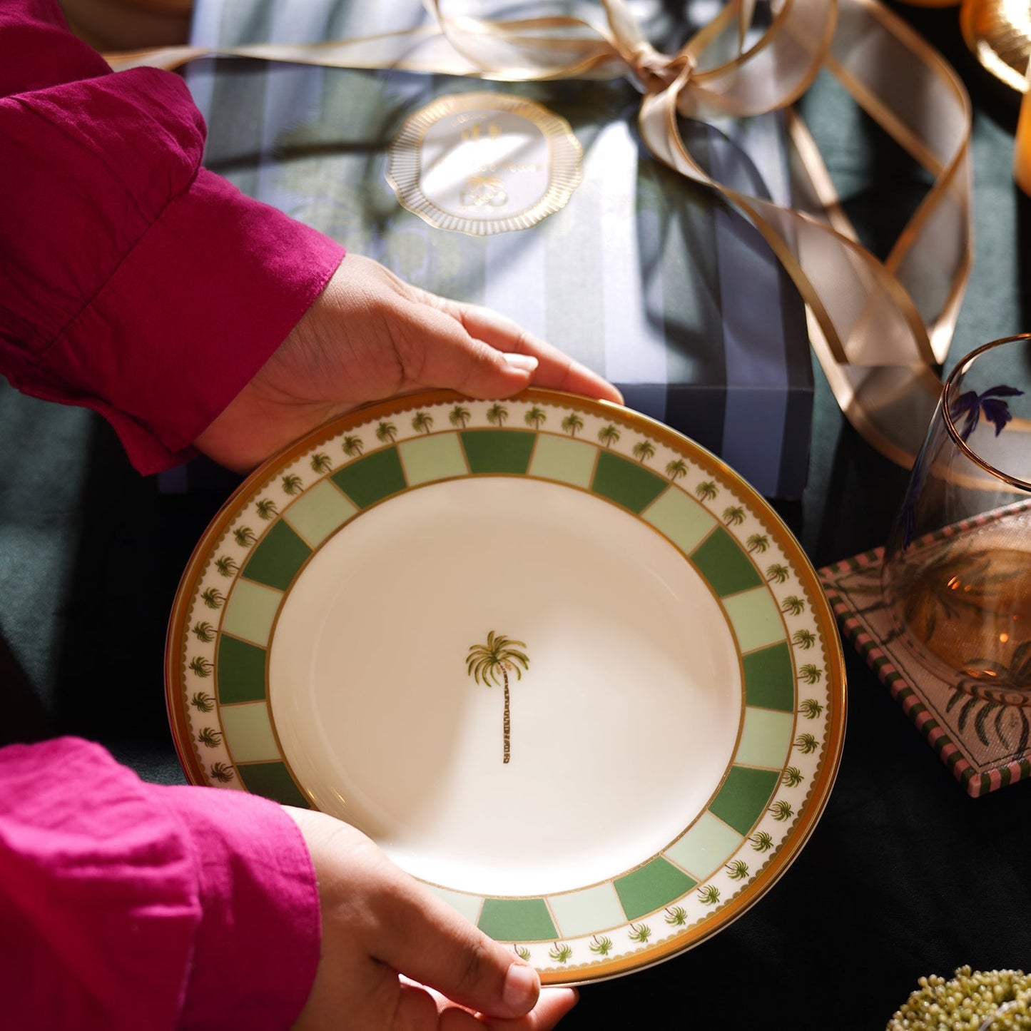 Set of 2 Pink & Green Palmera Print Porcelain Dessert Plates