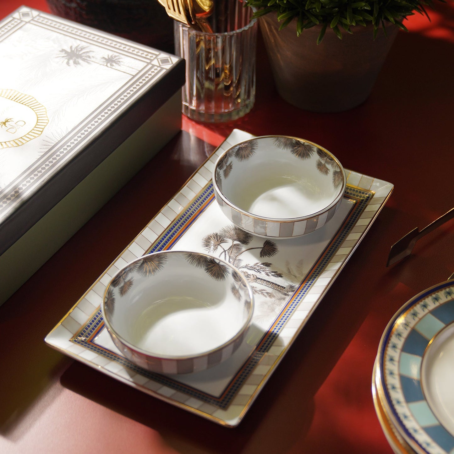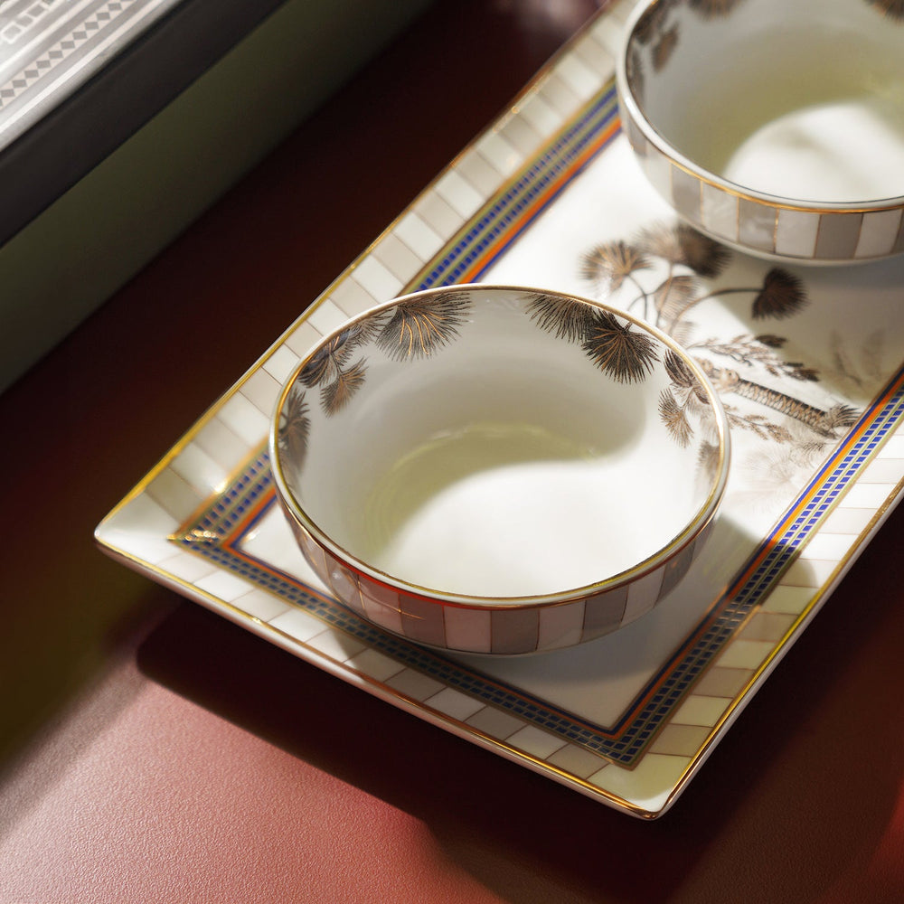 Beige & White Palmier Print Rectangular Porcelain Tray with Bowls