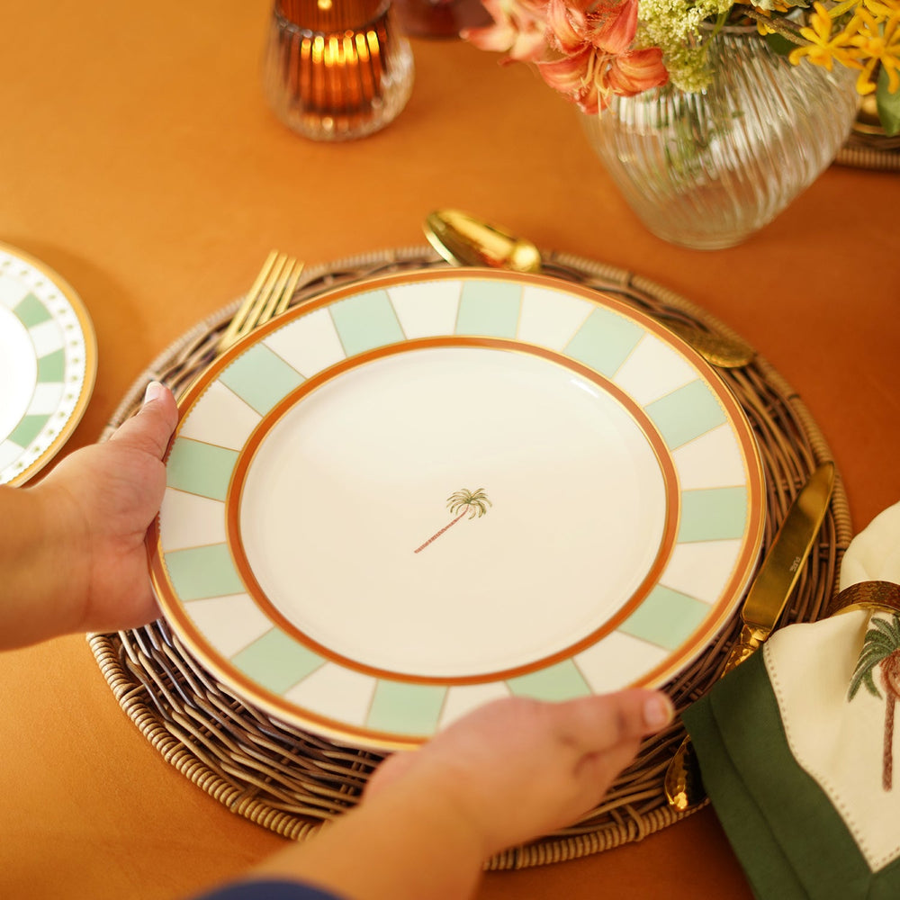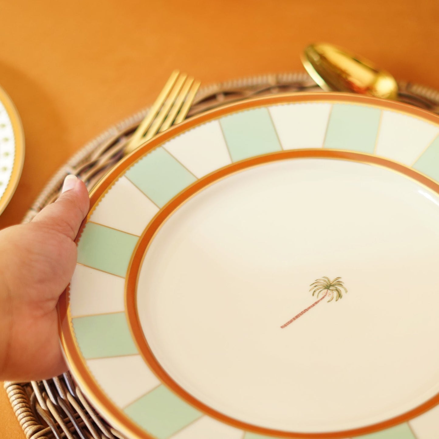 Make every meal an occasion with these orange and mint porcelain dinner plates. Setting the stage fo unforgettable parties, these plates can be mixed and matched to create the perfect tablescape. Thoughtfully designed as a part of our limited edition, Las Palmas collection, these plates are perfect for a festive, host-approved party atmosphere. They feature a sweet yet striking print and a glazed, glossy shine for an extra touch of brilliance.