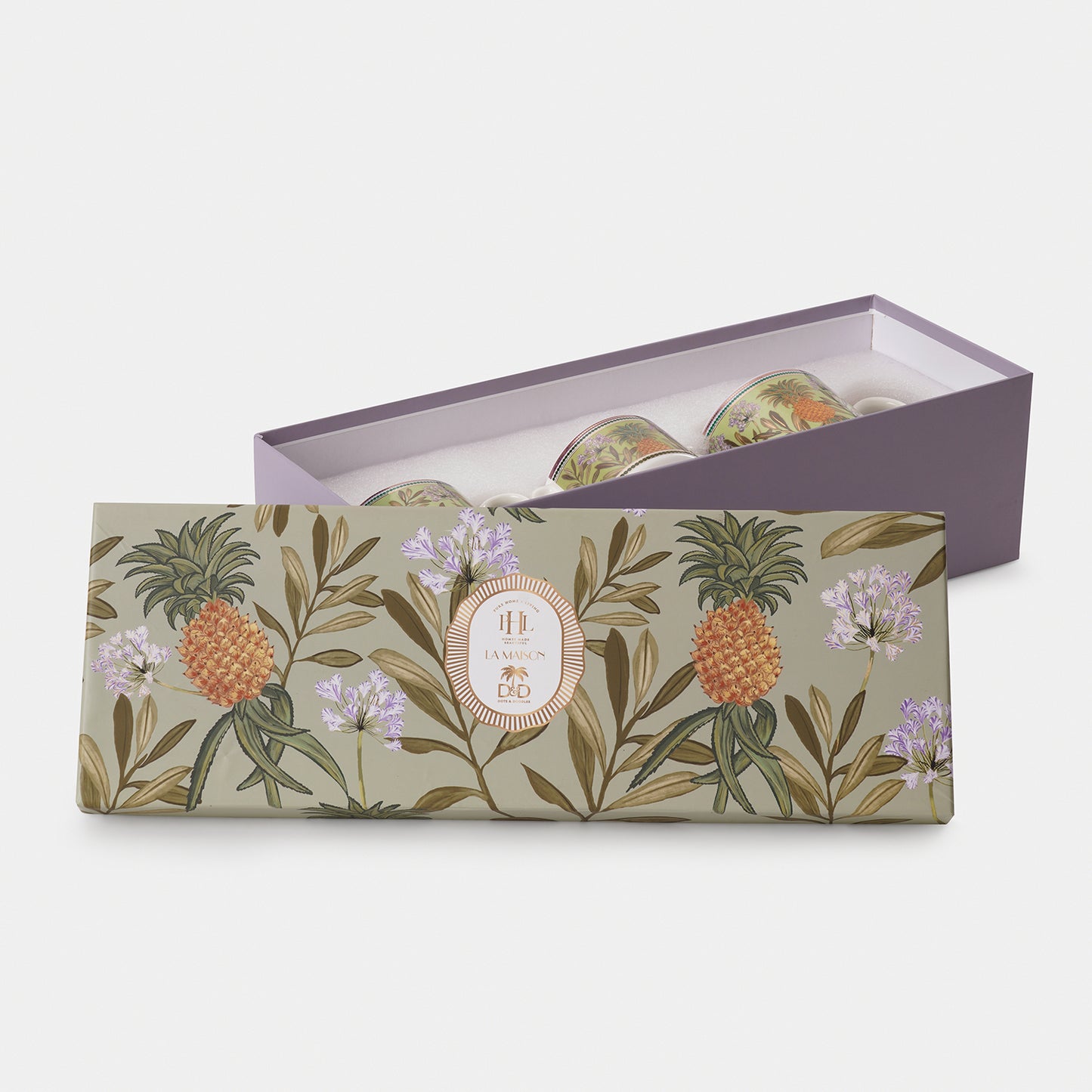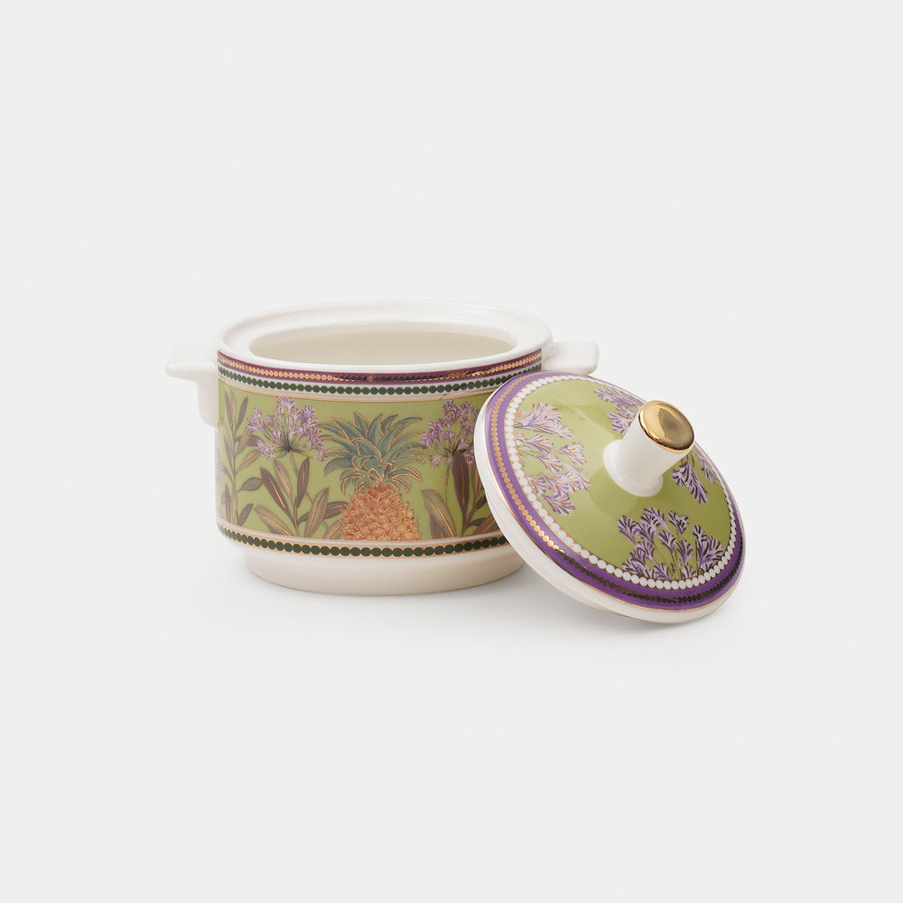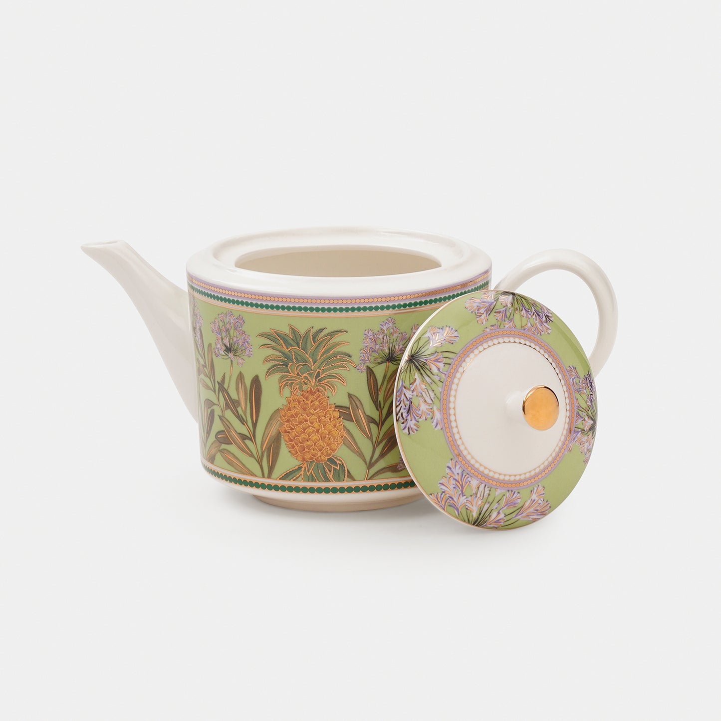 This green pineapple print tea pot, creamer and sugar pot features tropical botanical designs. A charming and elegant addition to tea-time gatherings.