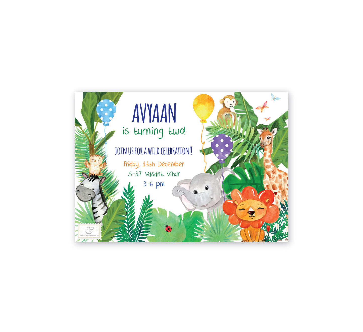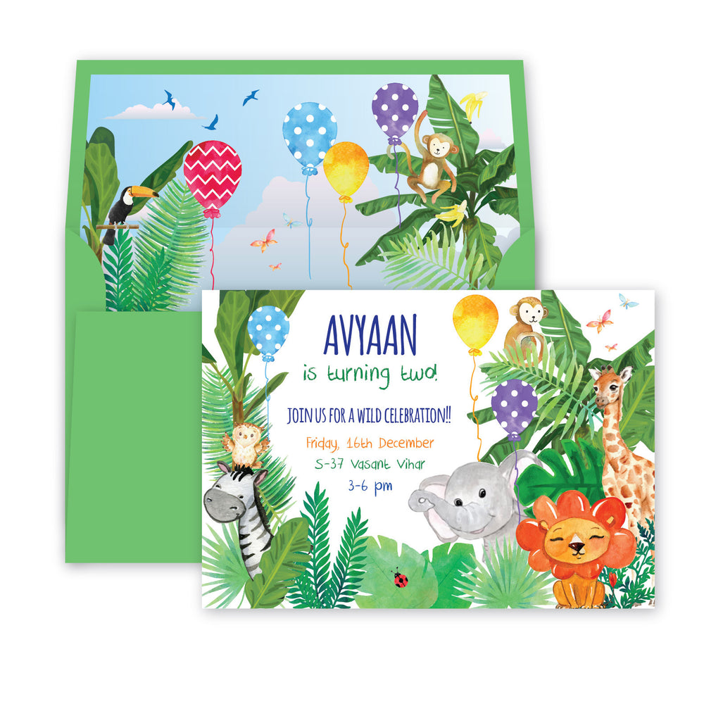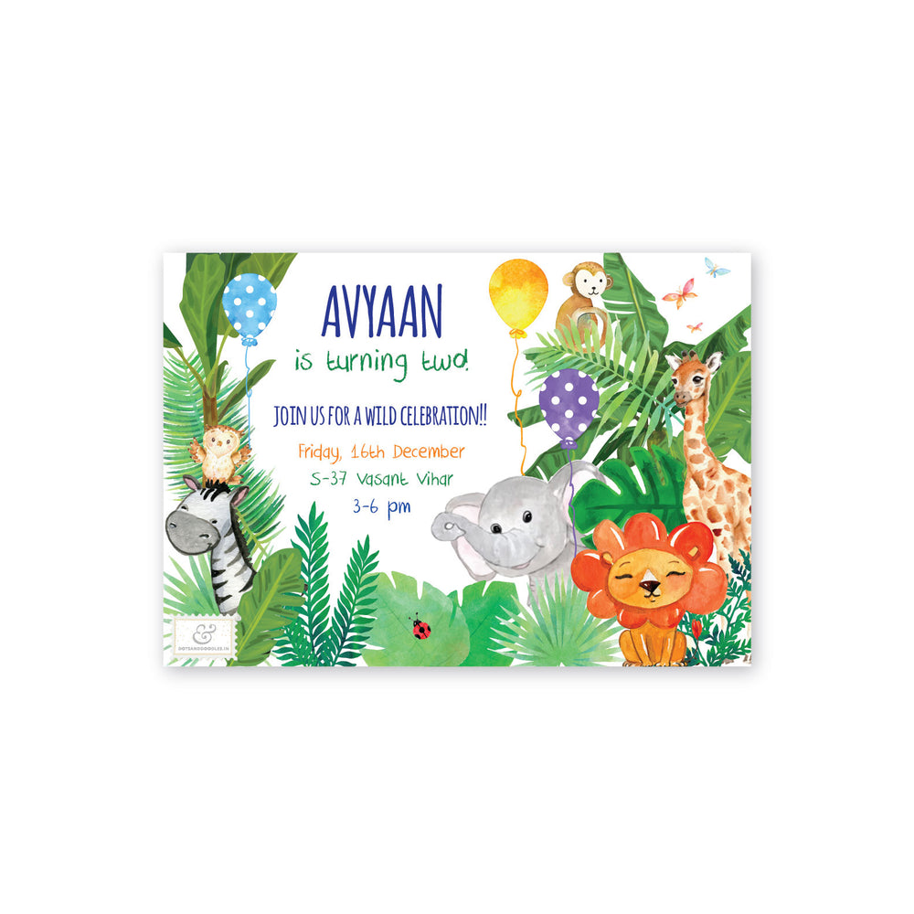 Kick off your Animal Safari Birthday Party in style with this customised birthday party invitation. Use the digital cards to send E-invites from your mobile or get your own set of beautiful printed invitations.