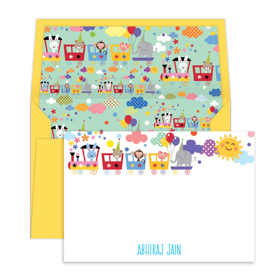 Cute Animals in the Train Notecards, illustrated with adorable trains with animals paired with an envelopes in yellow.