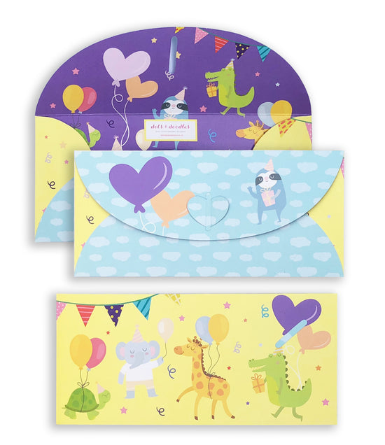 Cute Animals party kids gift envelopes, illustrated with adorable animals riding the party. Perfect for any occasion. Use it for a gift card or cash. Printed envelope, colorful lining inside. The envelope self locks, with a cute heart shape lock.