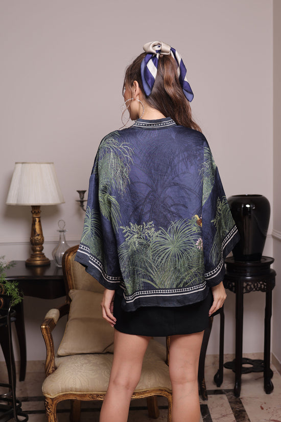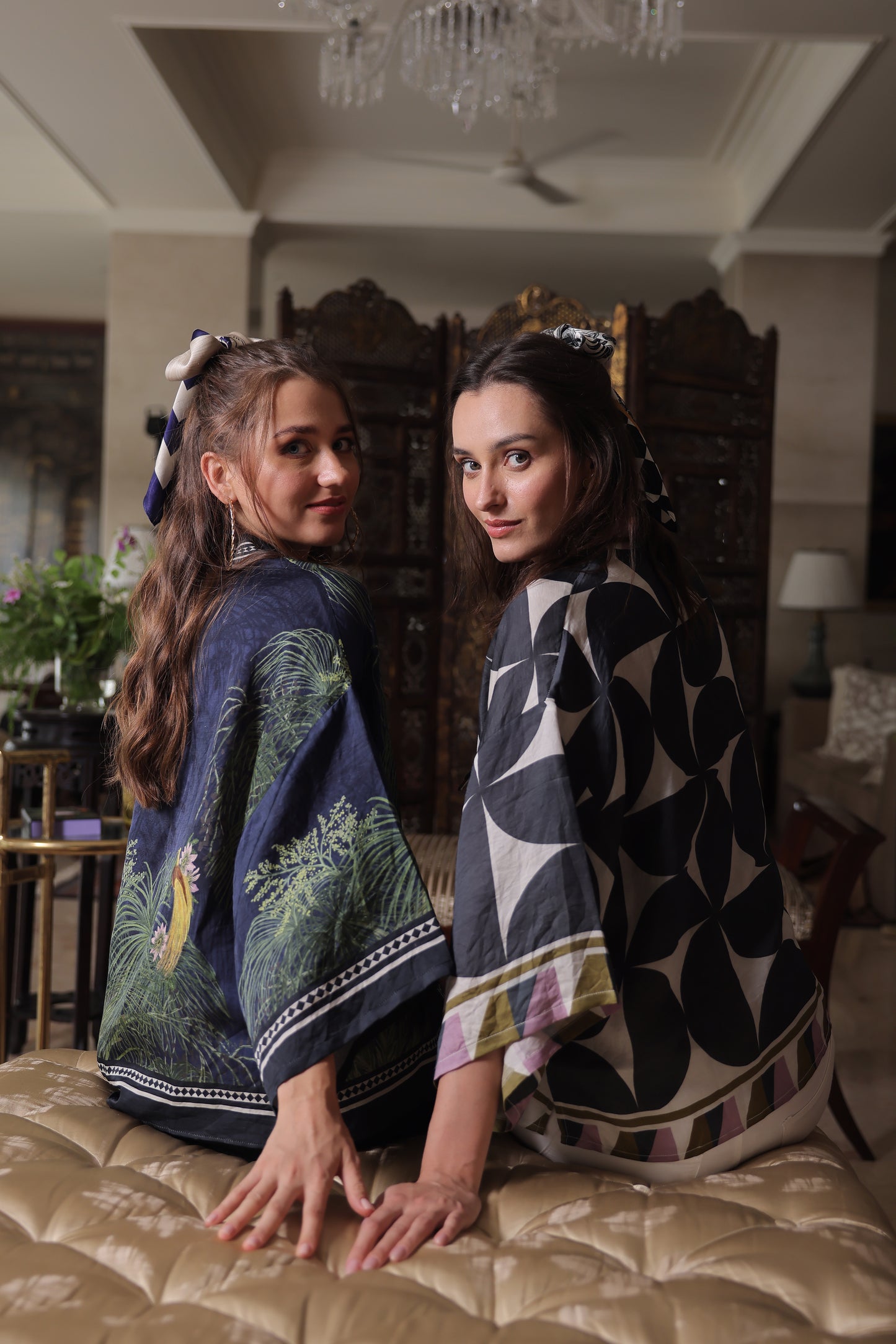 The Bergamo print captures a serene scene with its blue base adorned with delicate foliage and bird motifs, elegantly framed by a classic black and white border. Perfect for adding a touch of nature-inspired charm to any outfit.