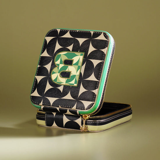 Chic and compact, this black and green 'B' faux leather jewellery box keeps your treasures safe and tangle-free on the go. Its bold design and secure structure make it the perfect companion for stylish, organized travel.