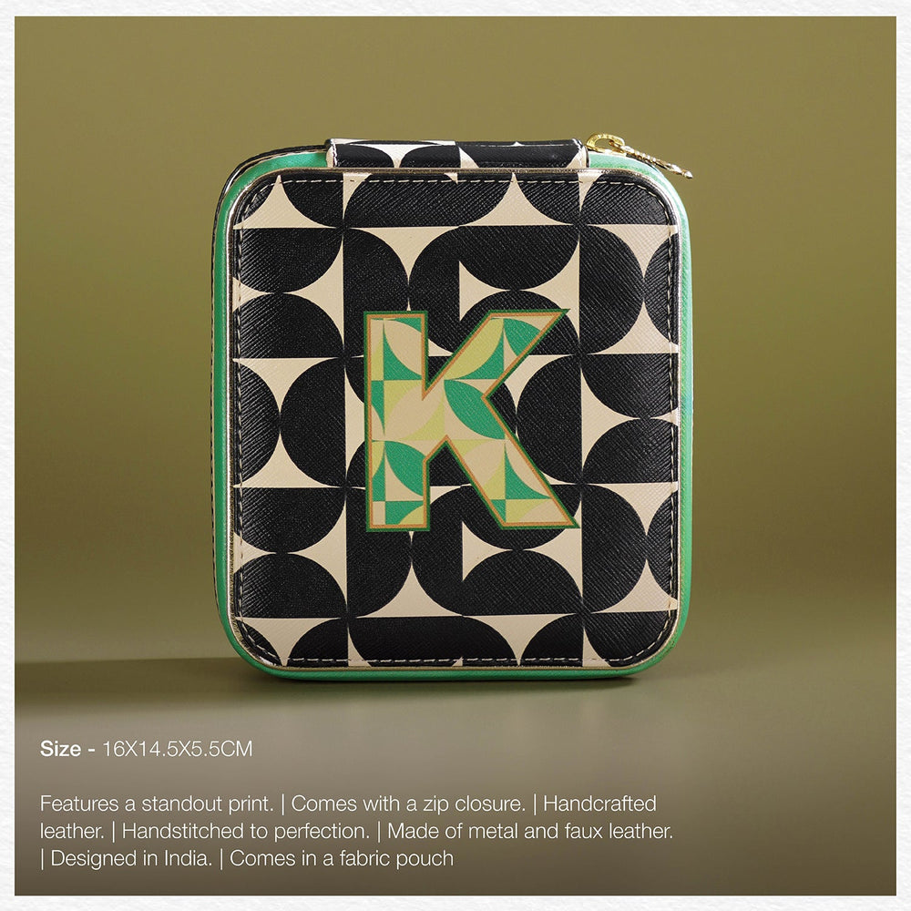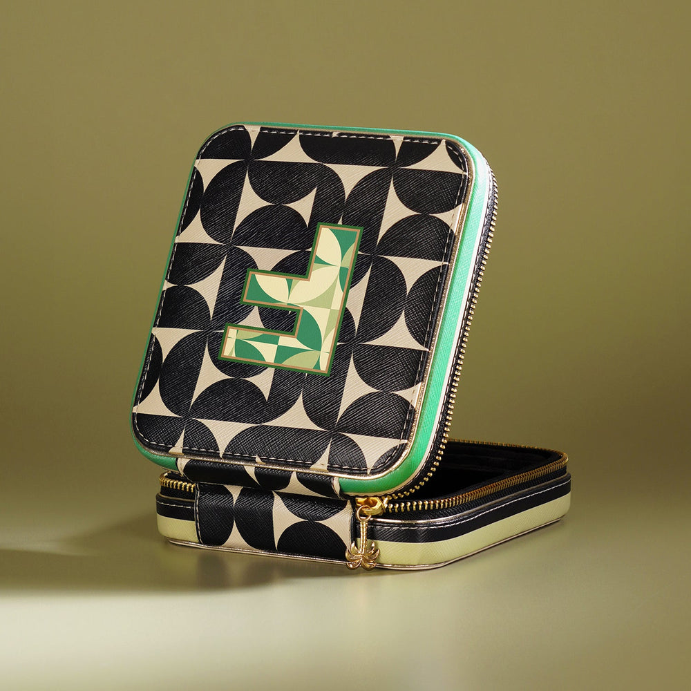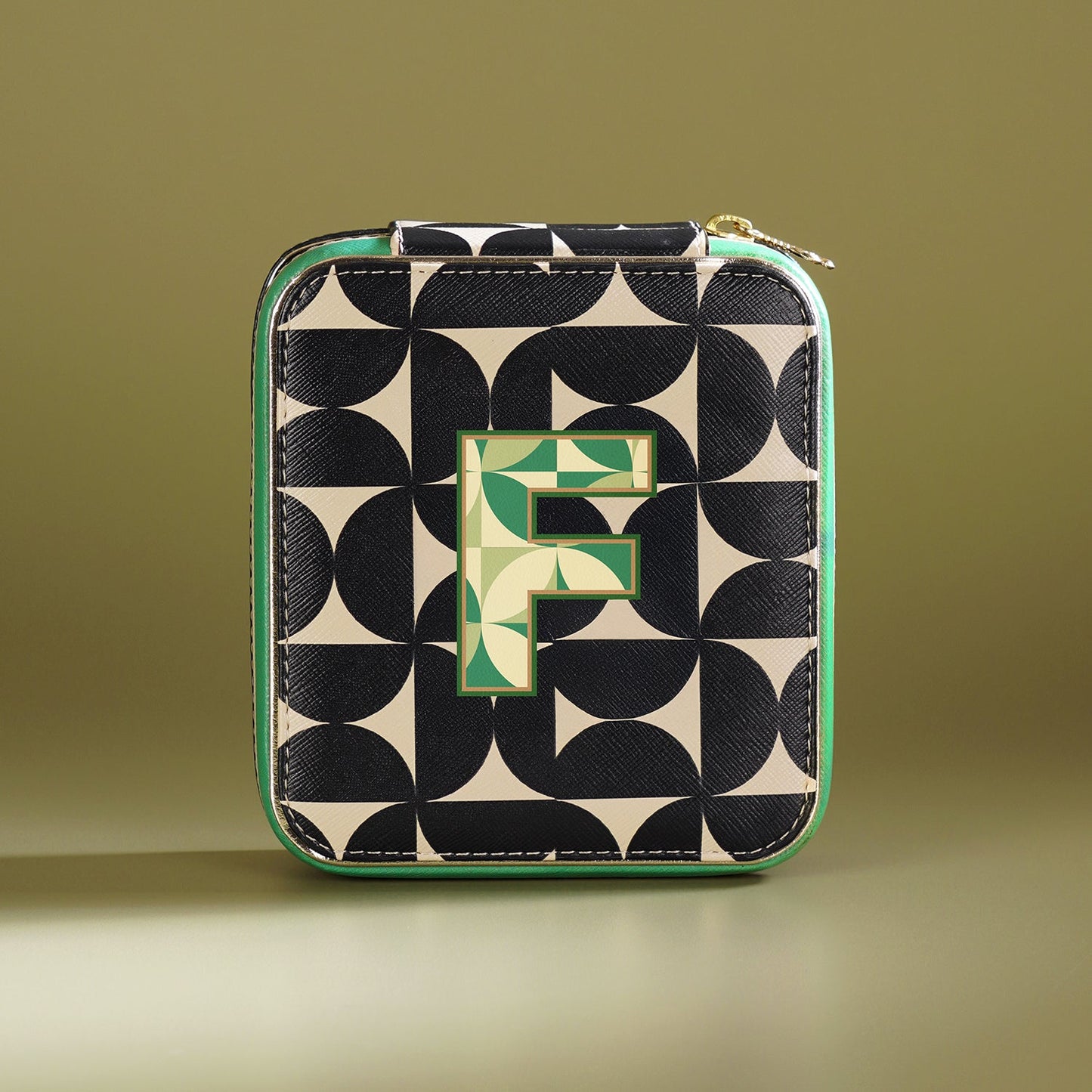 Chic and compact, this black and green 'F' faux leather jewellery box keeps your treasures safe and tangle-free on the go. Its bold design and secure structure make it the perfect companion for stylish, organized travel.