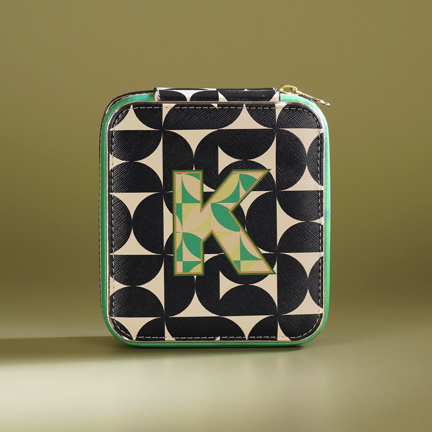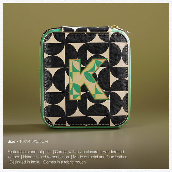 Chic and compact, this black and green 'K' faux leather jewellery box keeps your treasures safe and tangle-free on the go. Its bold design and secure structure make it the perfect companion for stylish, organized travel.