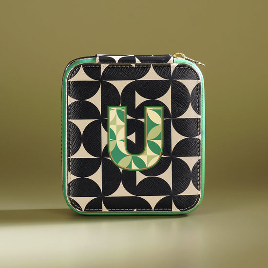 Chic and compact, this black and green 'U' faux leather jewellery box keeps your treasures safe and tangle-free on the go. Its bold design and secure structure make it the perfect companion for stylish, organized travel.