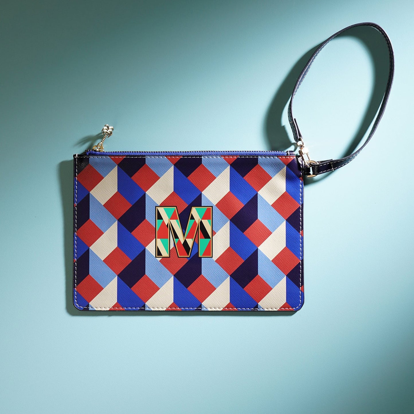 Sleek and versatile, the blue and peach 'M' flat travel pouch keeps your essentials organized with effortless style. Its bold design and compact form make it the perfect companion for every journey, near or far.