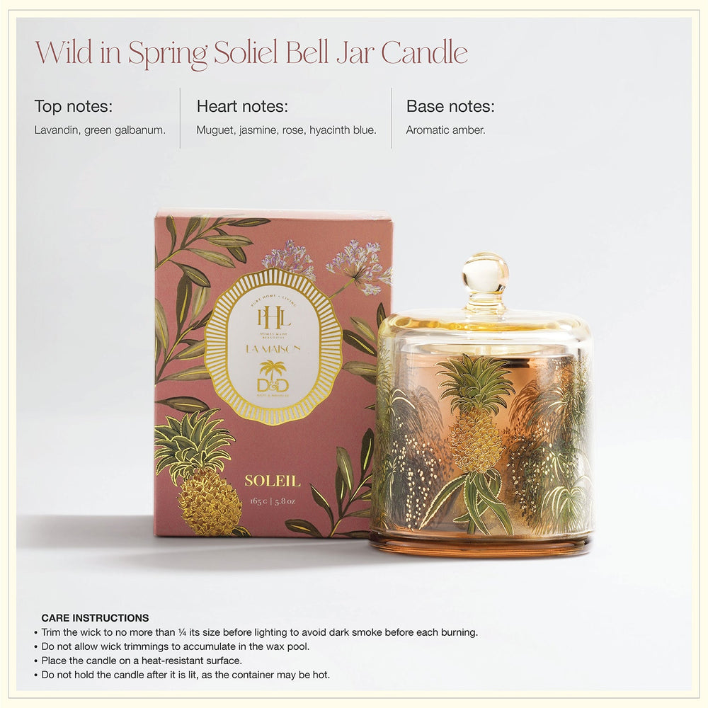 Create a tranquil and relaxing atmosphere with this wild in Spring soliel wax filled jar. Light the bell jar candle in any corner of your home to add a warm glow and lend an inviting scent to your space.