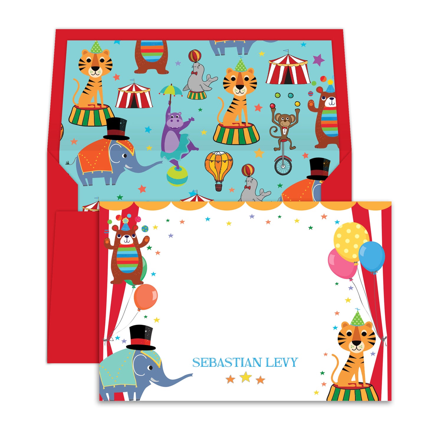 Carnival Notecards, illustrated with animals paired with an envelopes in red.