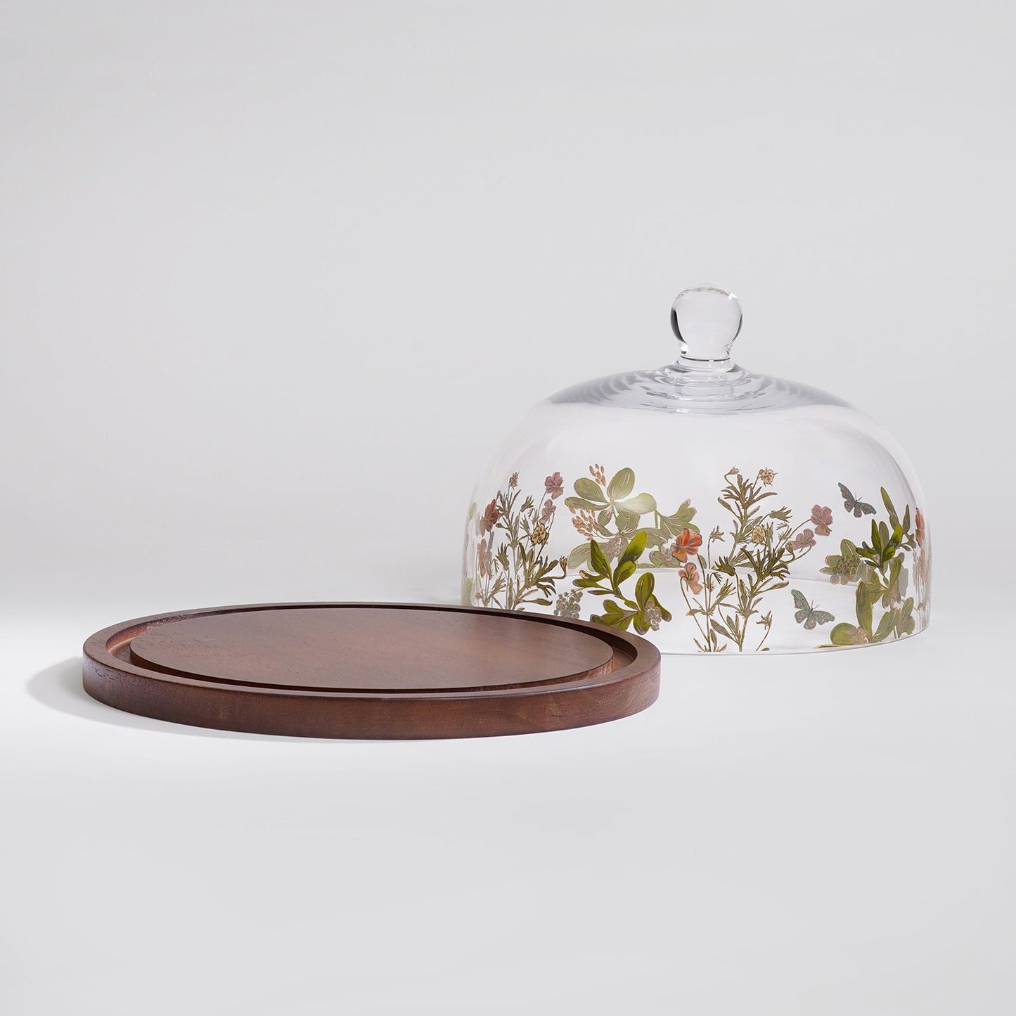 Elevate your serving style with this botanical glass cloche featuring floral and butterfly motifs. Its elegant dome paired with a rich wooden base keeps bakes and cheeses fresh while adding whimsical charm to your table.