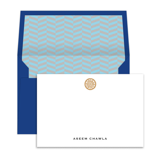 Central gold Motif with royal blue envelope. A set of 20 notecards with envelopes, use them to send a greeting or just to say thank you.