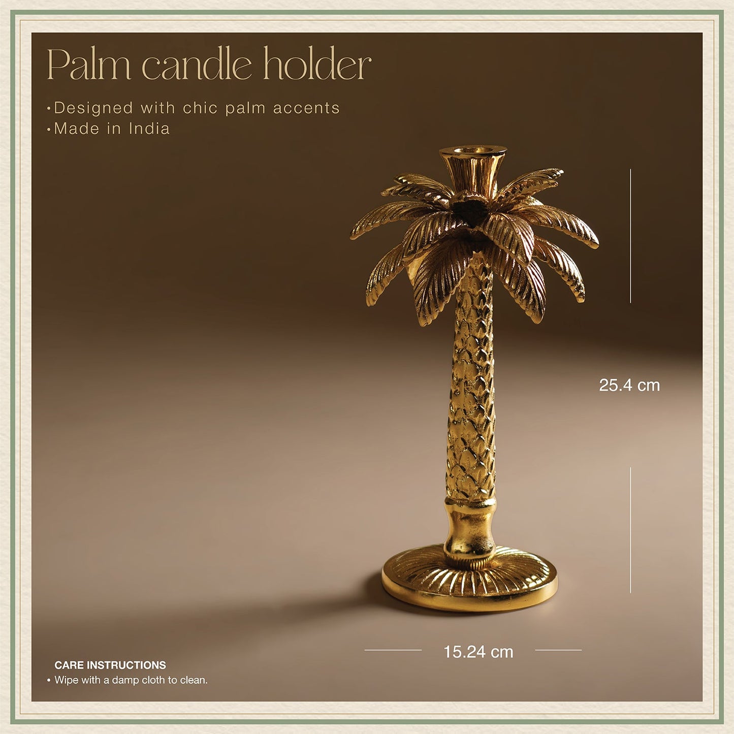 This sleek gold palm candle holder features elegant palm detailing, lending warmth and a dash of tropical glamour to any space. Perfect for creating a cozy, stylish glow.