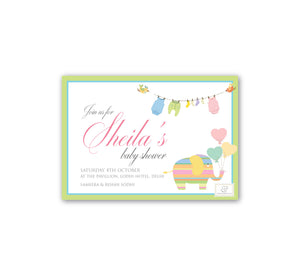 Honor the parents to be with Here comes the baby card. Illustrated with a baby clothes line and a happy elephant. Paired with a yellow envelope, striped lining.
