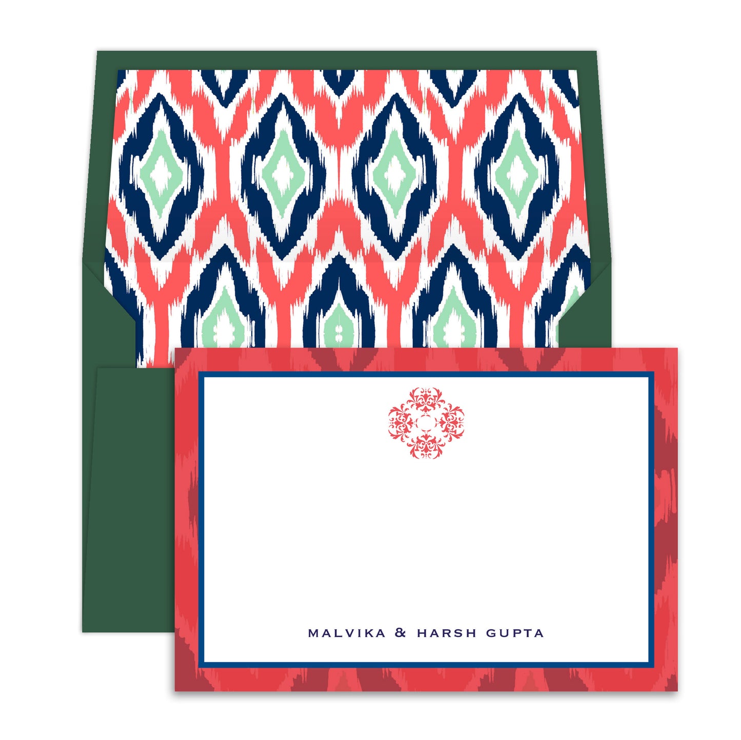 Ikat pattern with a mirrored motif. Green Colored envelope with ikat printed lining. Use them to send a greeting or just to say thank you.