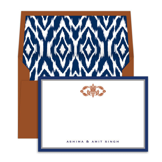 Ikat pattern with a motif. rust orange envelope with ikat printed lining. Use them to send a greeting or just to say thank you.