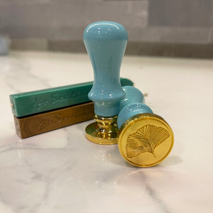 This stamp has an engraved leaf motif and comes with teal and antique gold wax sticks.