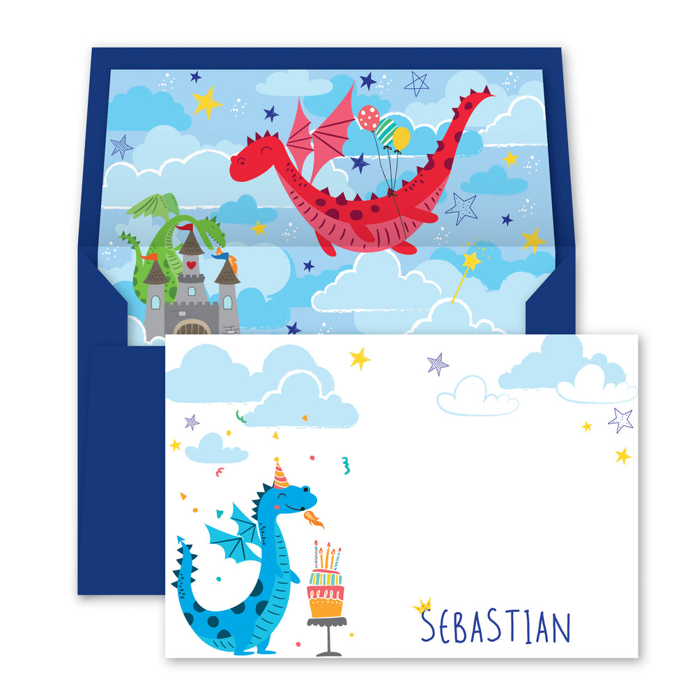 Magical Dragons personalised set of boxed notecards paired with lined envelopes, illustrated with dragons and a castle. These fun notecards can be used to send a greeting or as thank you, and even make a great gift.