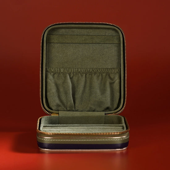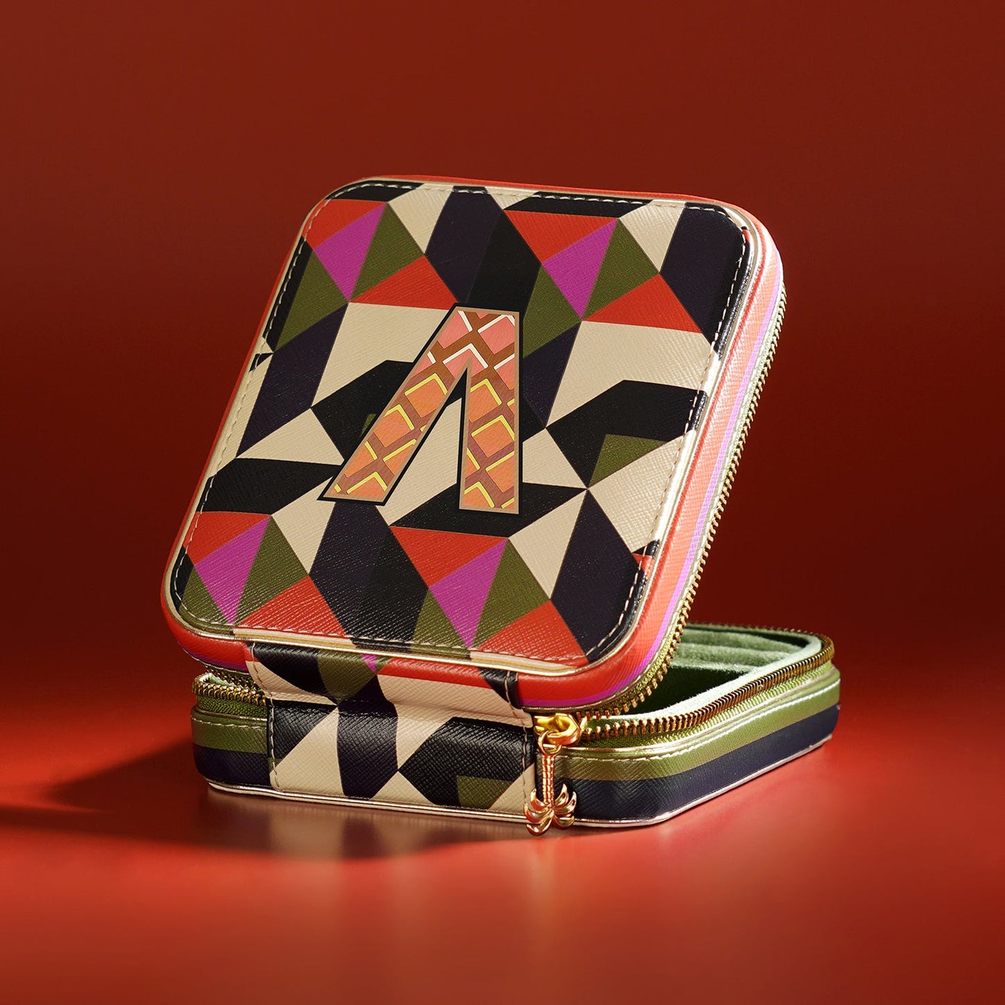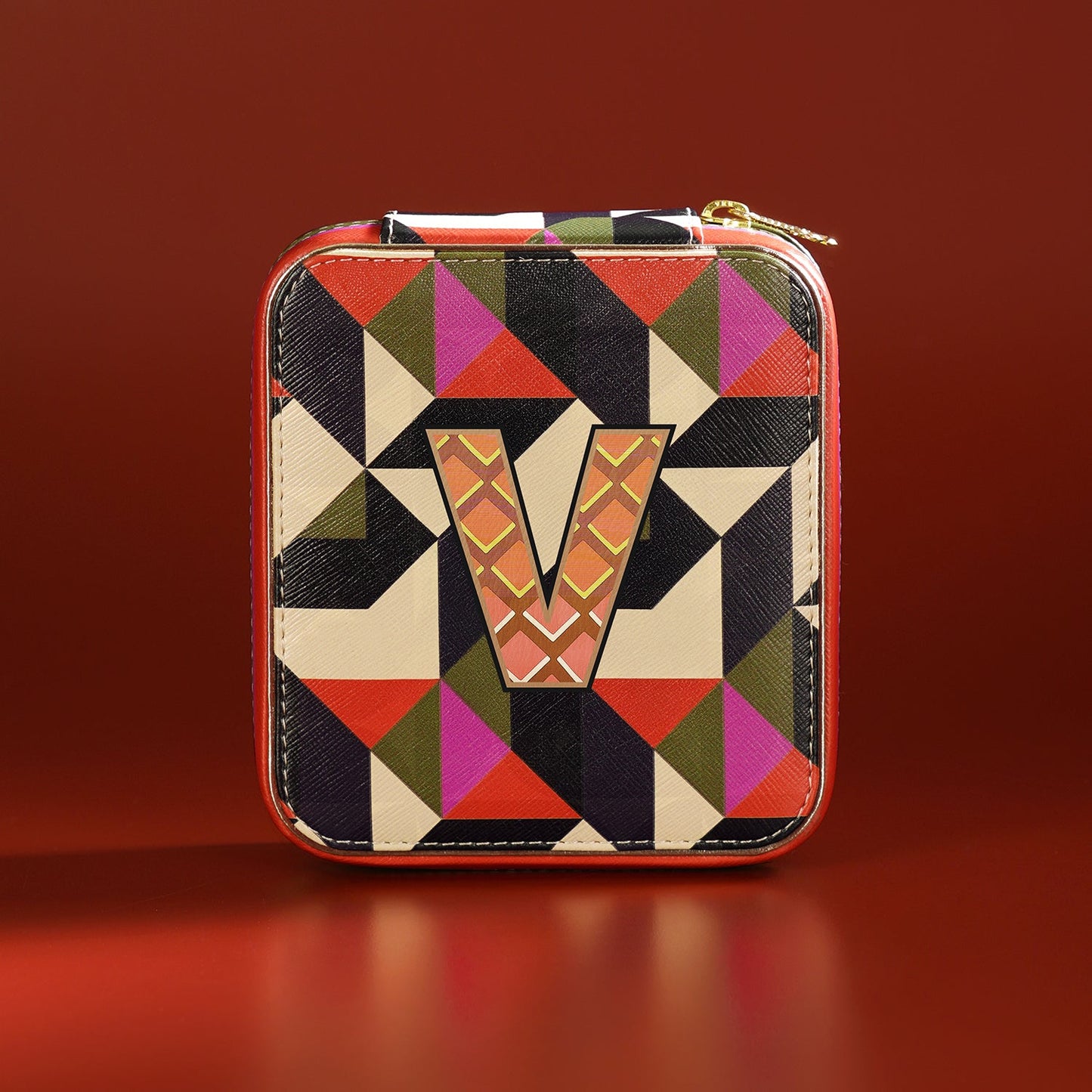 Chic and compact, this orange and pink 'V' faux leather jewellery box keeps your treasures safe and tangle-free on the go. Its bold design and secure structure make it the perfect companion for stylish, organized travel.
