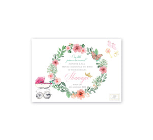 Our Little Princess Announcement, Illustrated with a floral wreath and baby carriage. Paired with a pink envelope, a magical cloudy lining.
