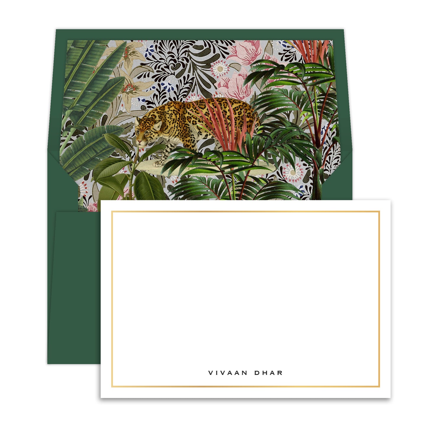 Panthera personalised set of boxed notecards paired with green envelopes, with an illustrated lining. These notecards can be used to send a greeting or as thank you, and even make a great gift.