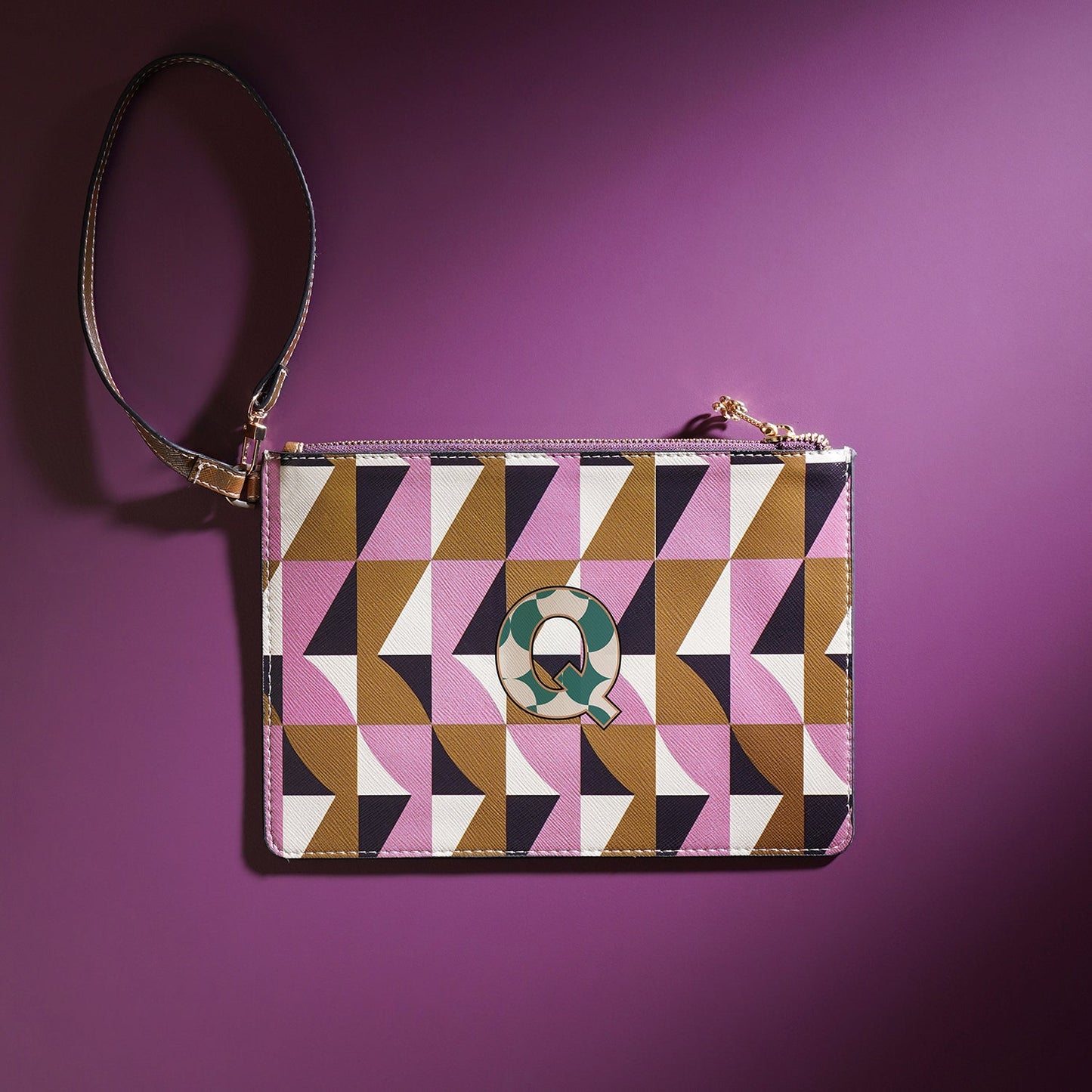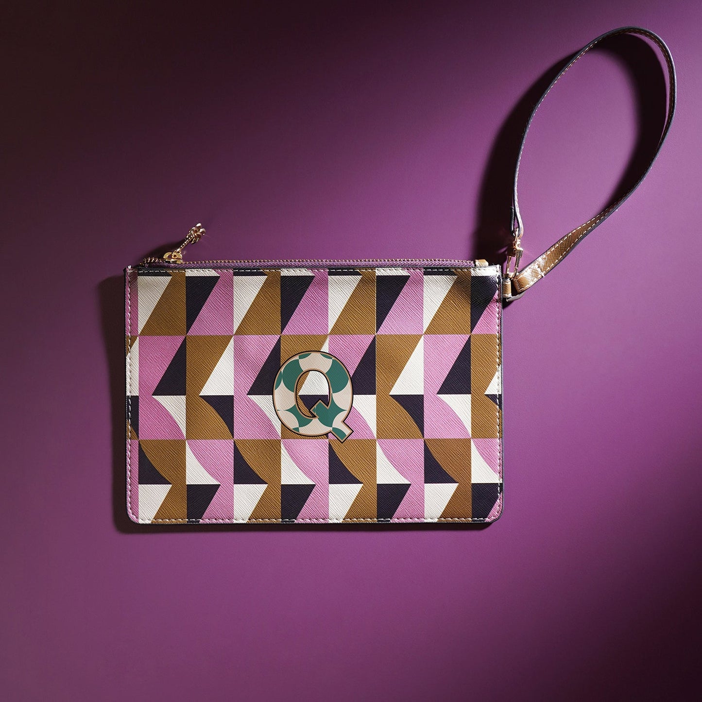 Sleek and versatile, the pink and green 'Q' flat travel pouch keeps your essentials organized with effortless style. Its bold design and compact form make it the perfect companion for every journey, near or far.