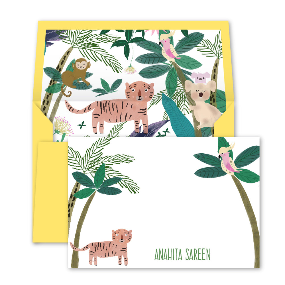 Pink Tiger personalised set of boxed notecards paired with envelopes, lined with illustrated jungle with adorable animals. These fun notecards can be used to send a greeting or as thank you, and even make a great gift.