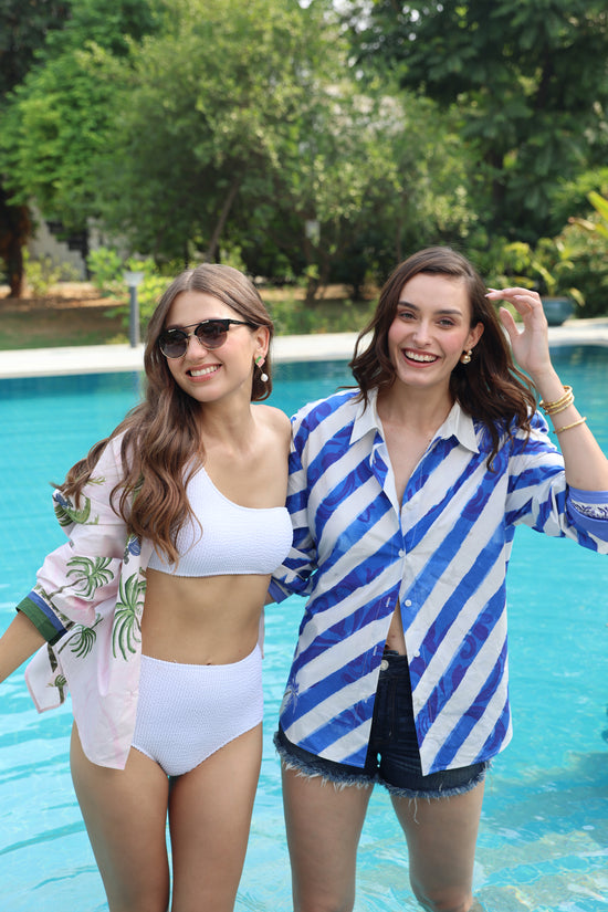 The Positano print features blue stripes and palm motifs, capturing the breezy vibe of an Italian summer. Perfect for adding a touch of Mediterranean charm to your wardrobe.